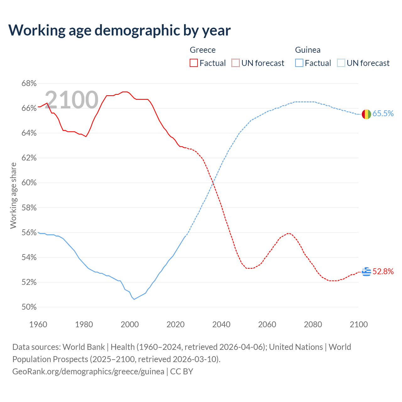 Median age Greece vs Guinea, 1960-2100