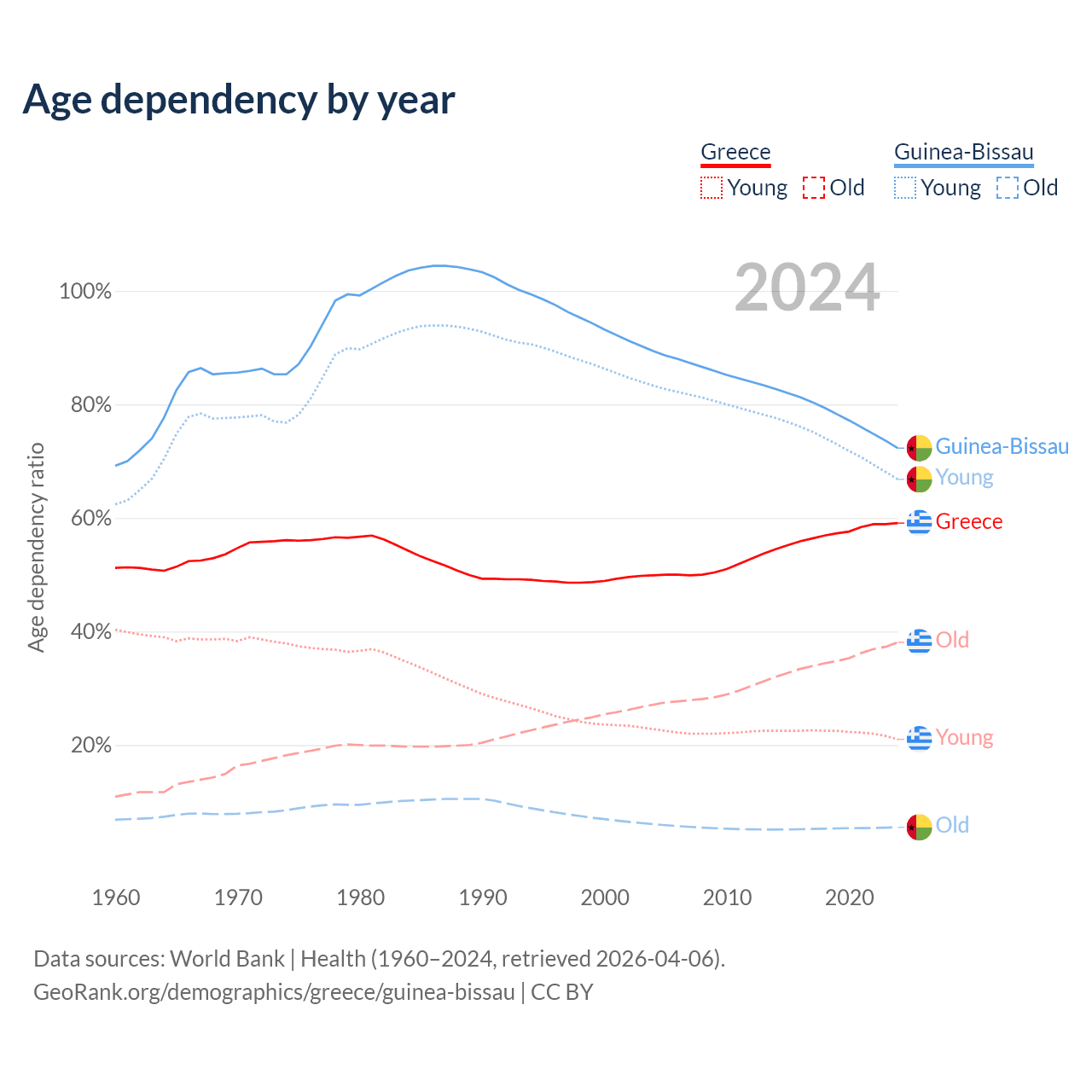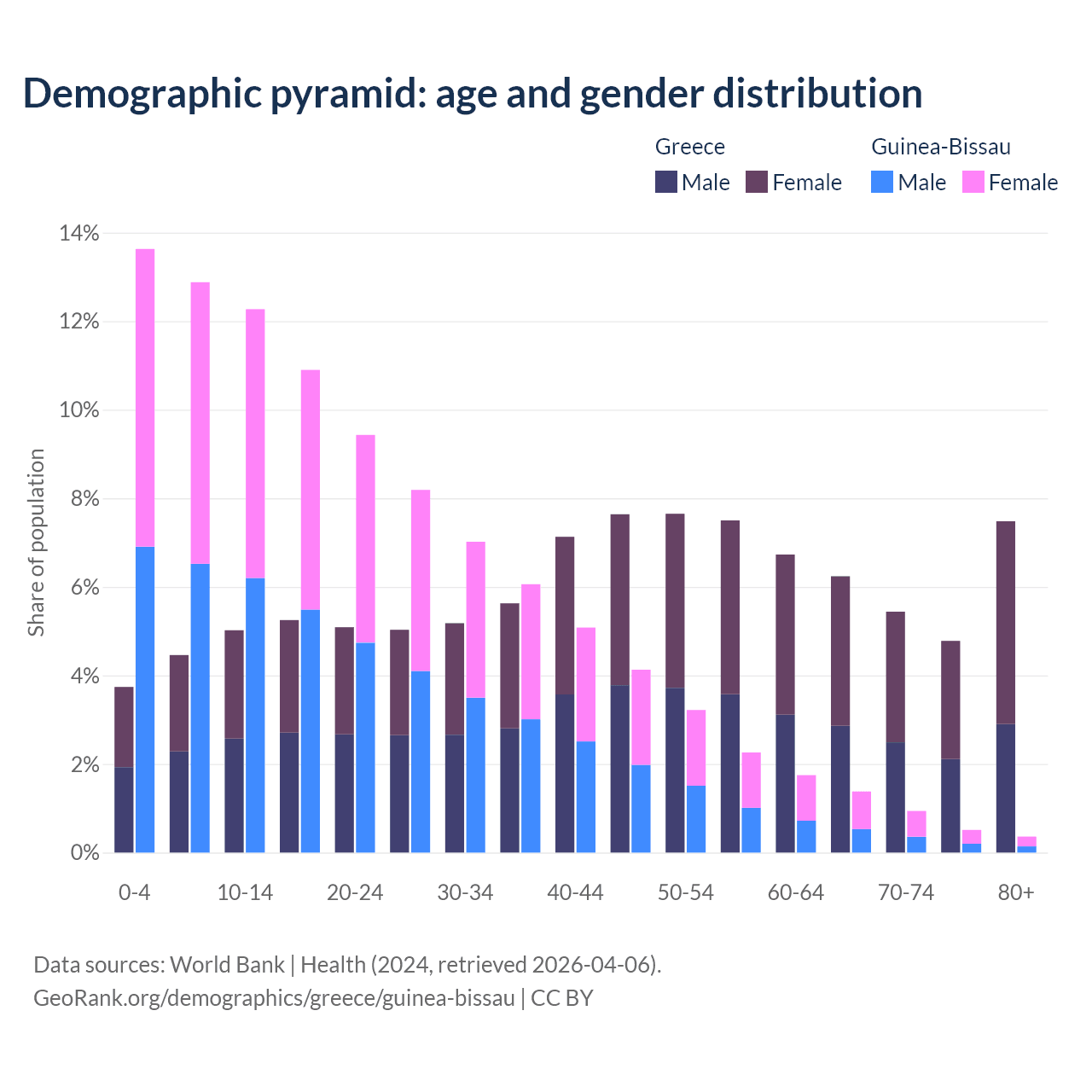- Greece is ranked 6/196 by median age (oldest to youngest) vs 164/196 for Guinea-Bissau.