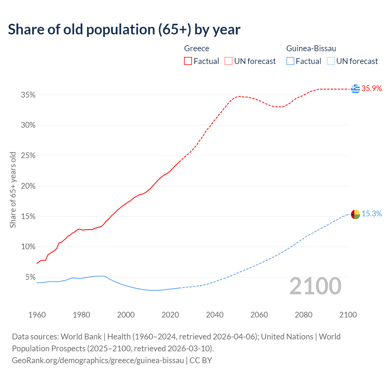The share of older people aged 65 and over is 23.9% in Greece and 3.19% in Guinea-Bissau. Life expectancy in Greece compared to Guinea-Bissau .