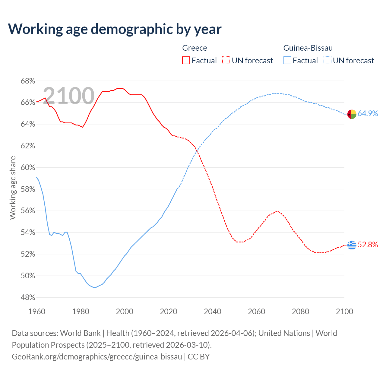 - Greece has 6.4M working age adults (aged 15-64) vs 1.34M in Guinea-Bissau.