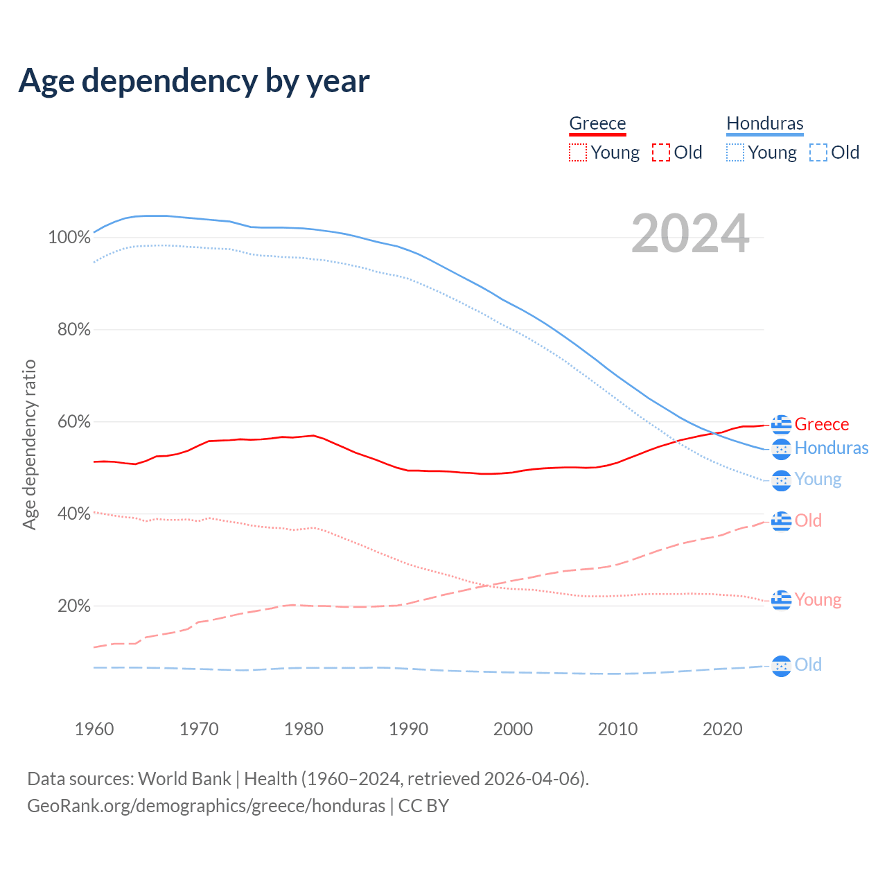 - Greece is ranked 6/196 by median age (oldest to youngest) vs 134/196 for Honduras.