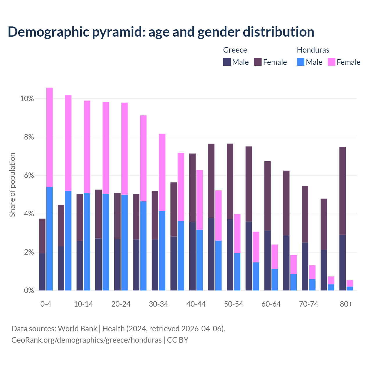 - As of 2026, the population of Greece is 10.2M vs 11.2M in Honduras.