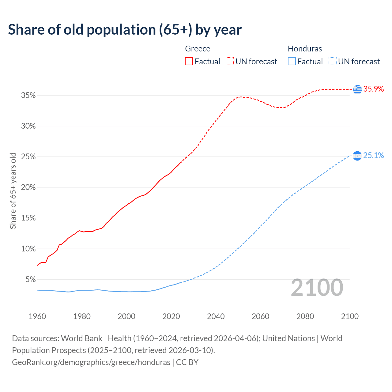The share of older people aged 65 and over is 23.9% in Greece and 4.42% in Honduras. Life expectancy in Greece compared to Honduras .