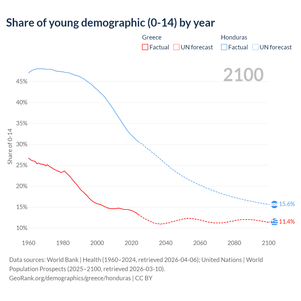 - The share of young demographic (0-15 years old) in Greece is 13.2% vs 30.6% in Honduras.