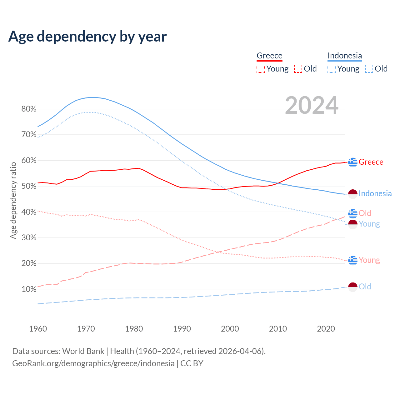 - Greece is ranked 6/196 by median age (oldest to youngest) vs 93/196 for Indonesia.