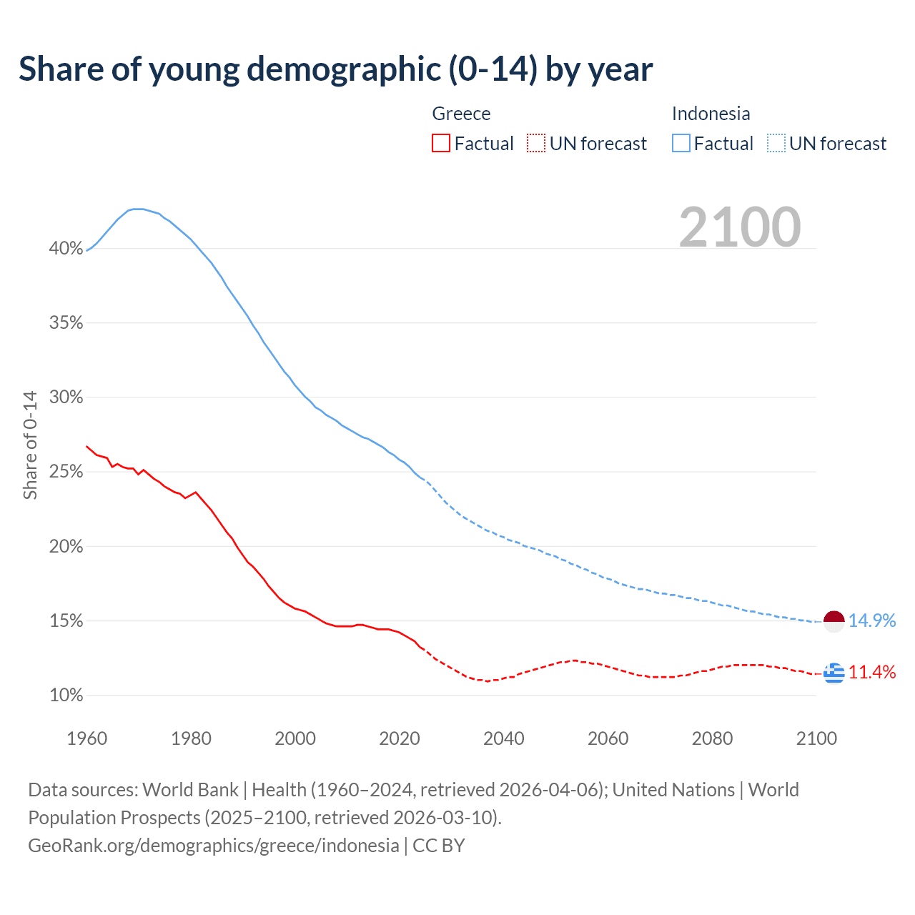 - The share of young demographic (0-15 years old) in Greece is 13.2% vs 24.6% in Indonesia.