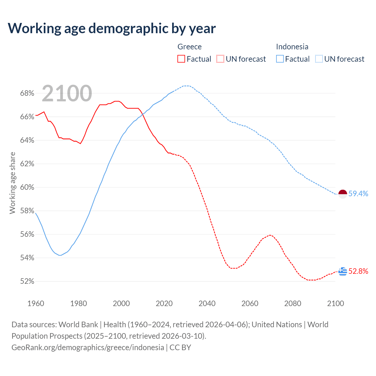 Median age Greece vs Indonesia, 1960-2100