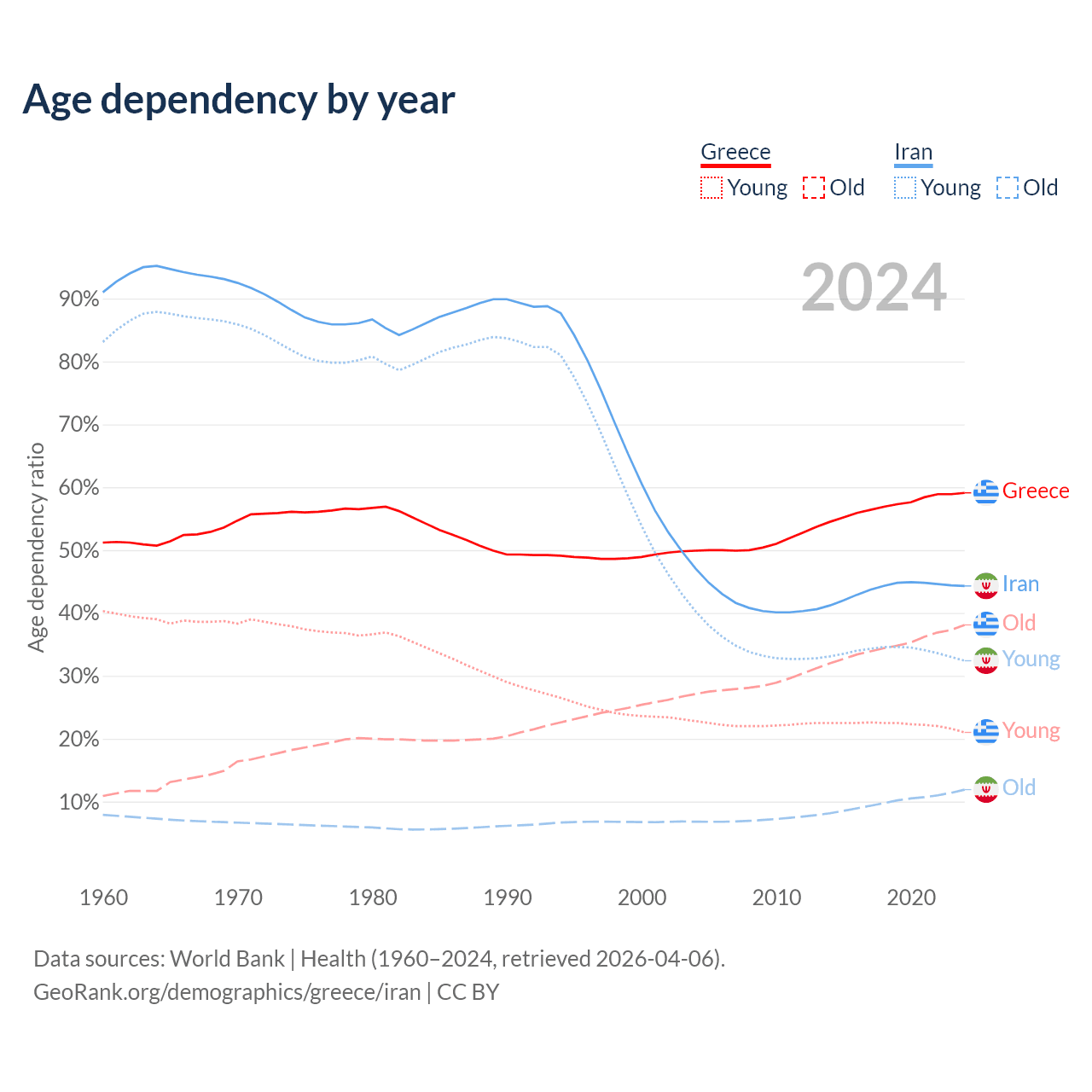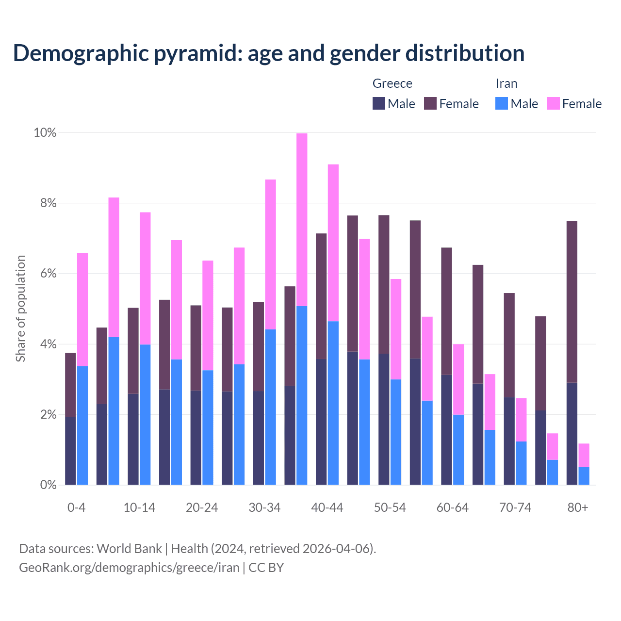 - Greece is ranked 6/196 by median age (oldest to youngest) vs 79/196 for Iran.