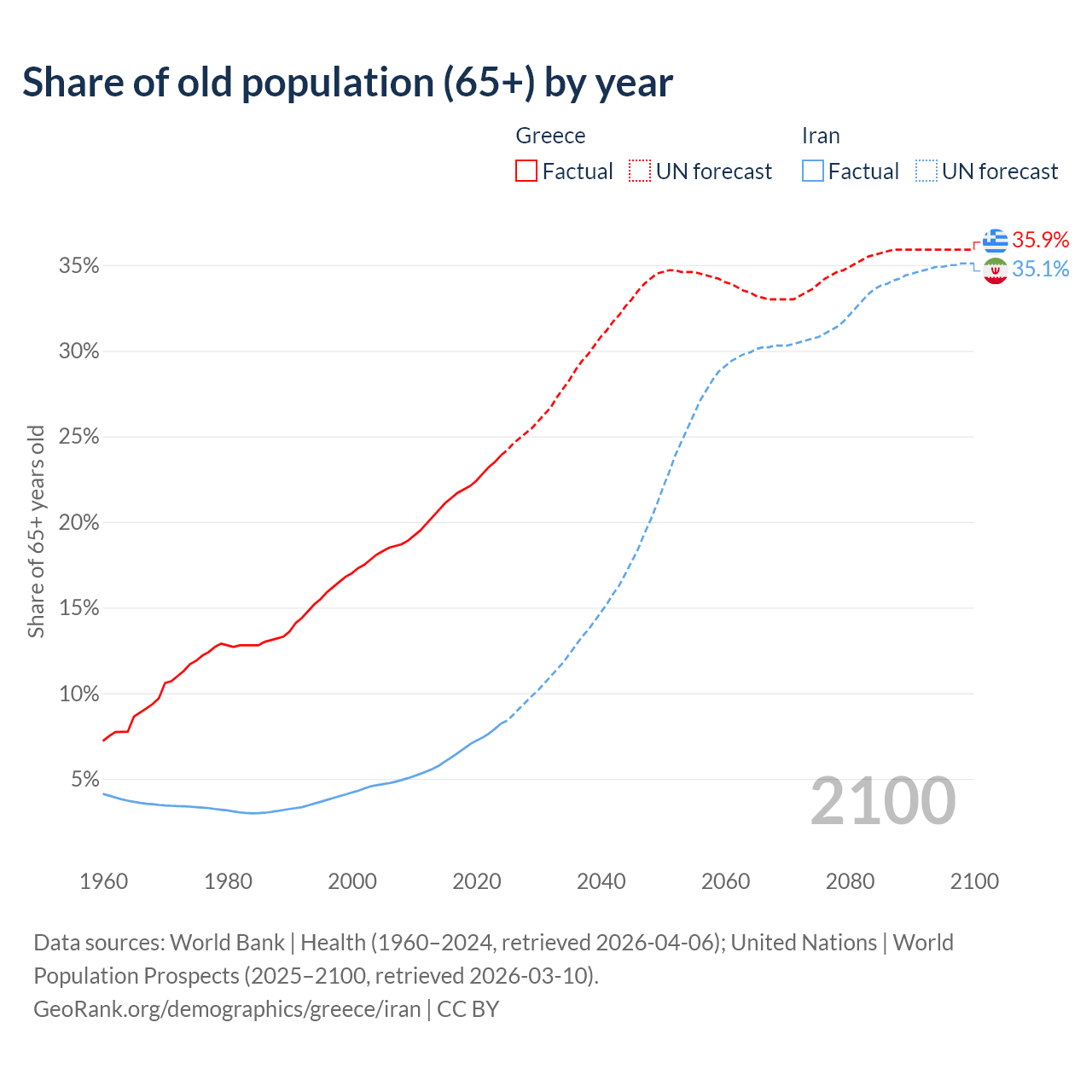 - The share of old-age demographic (65+) in Greece is 23.9% vs 8.24% in Iran.
