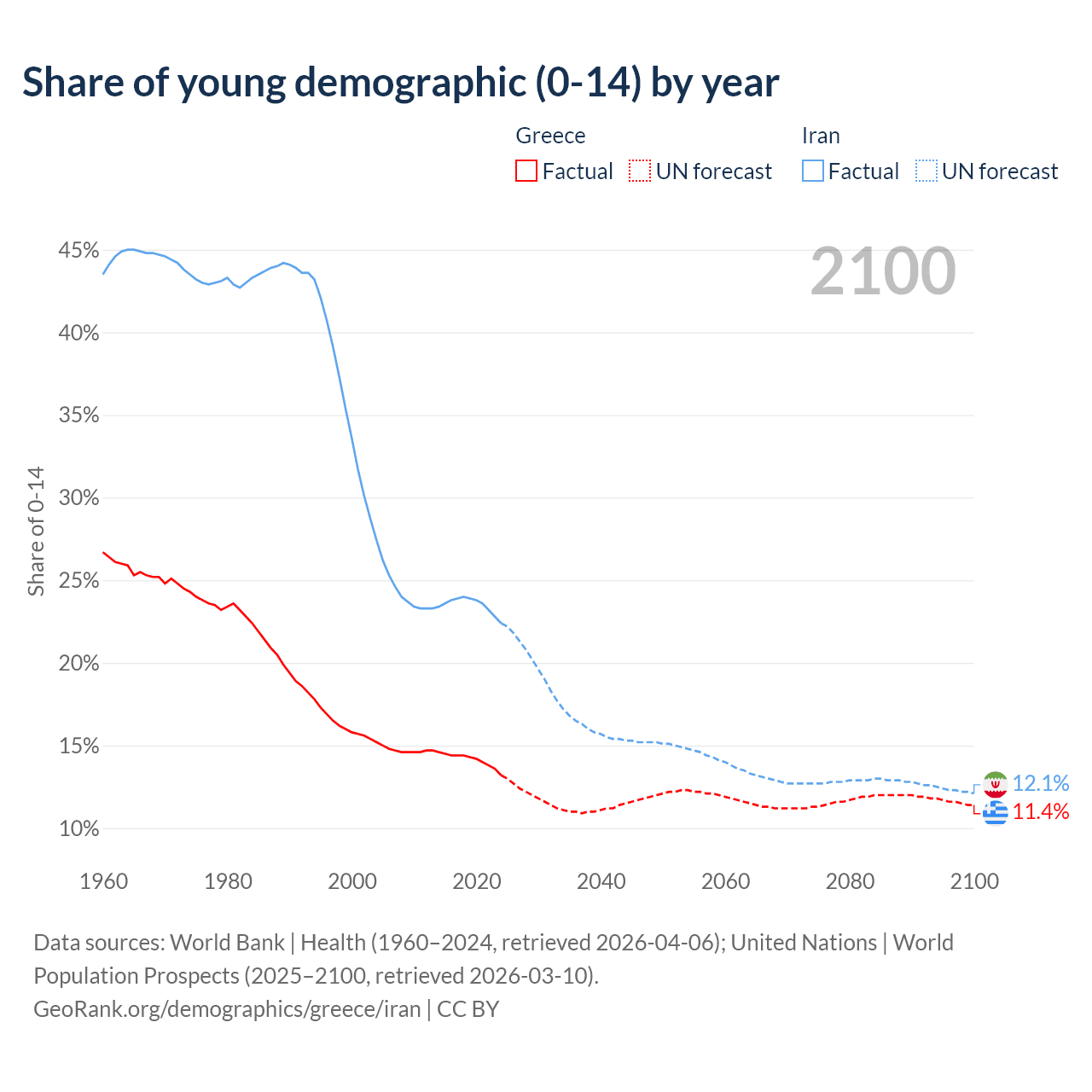 - The share of young demographic (0-15 years old) in Greece is 13.2% vs 22.4% in Iran.