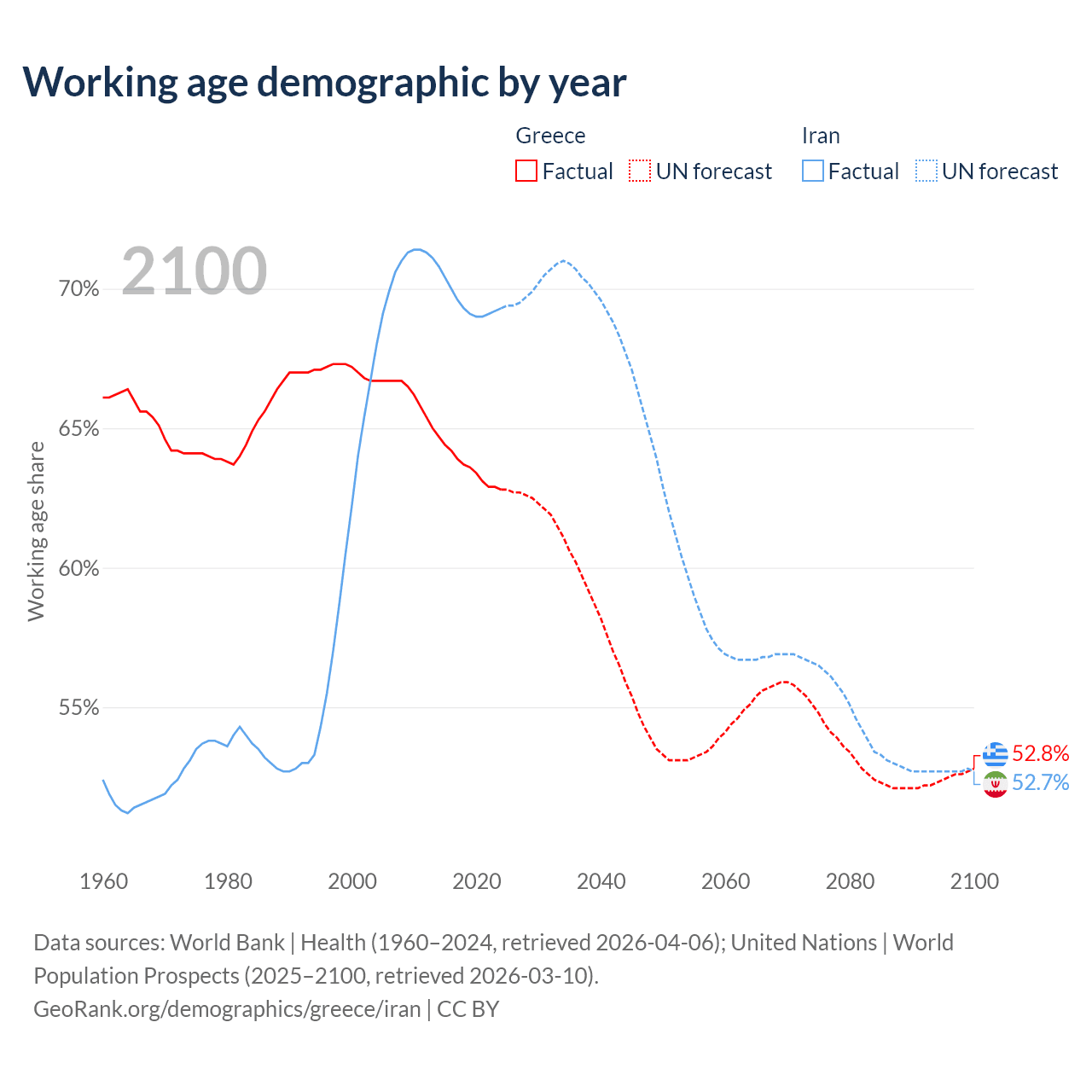- Greece has 6.4M working age adults (aged 15-64) vs 64.8M in Iran.