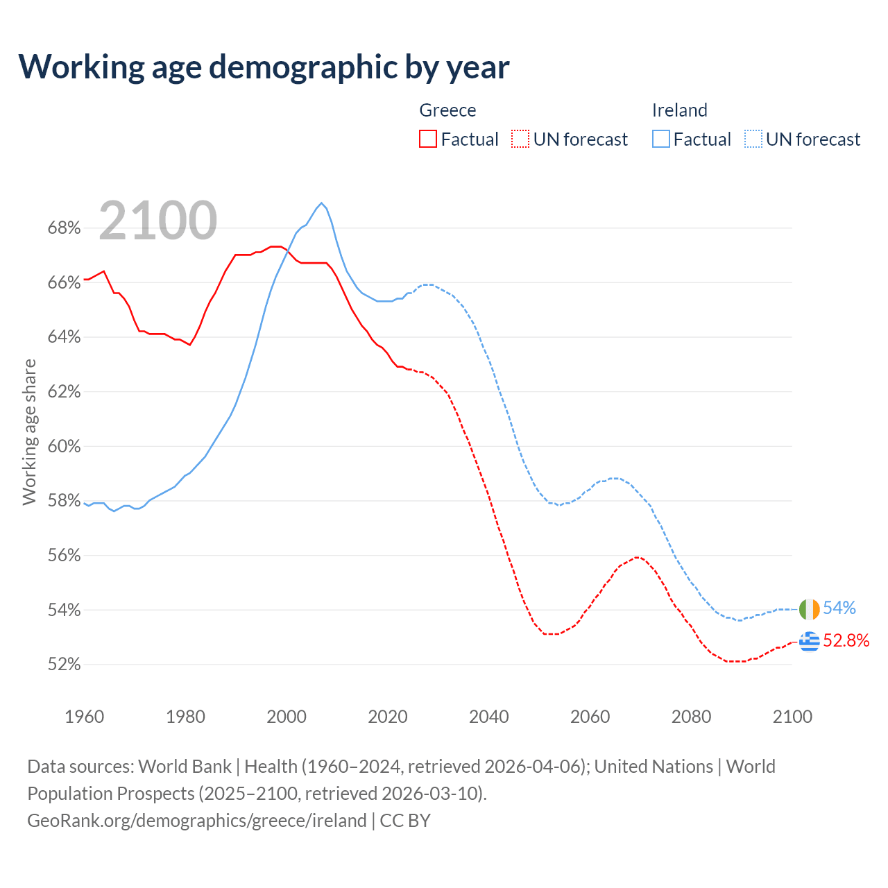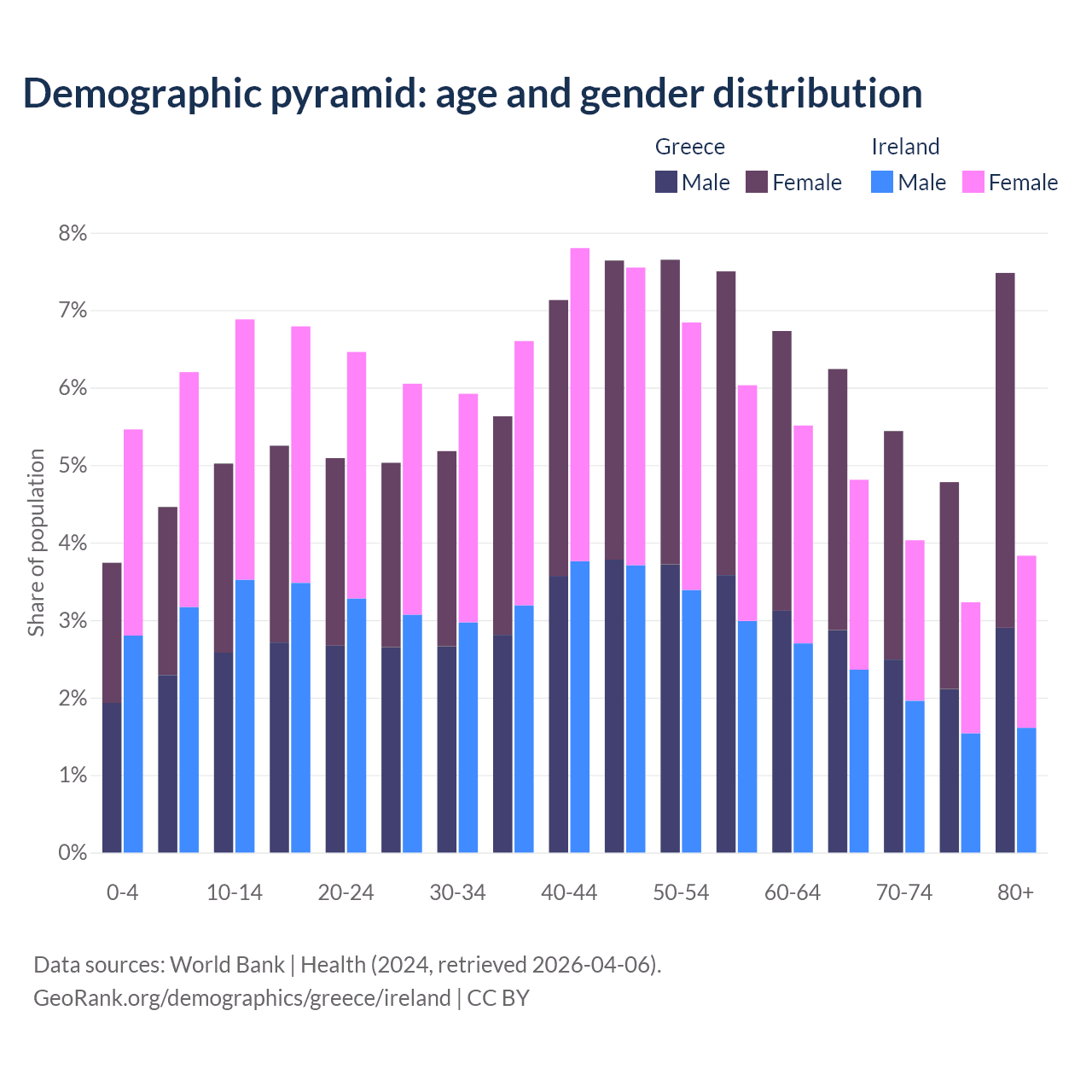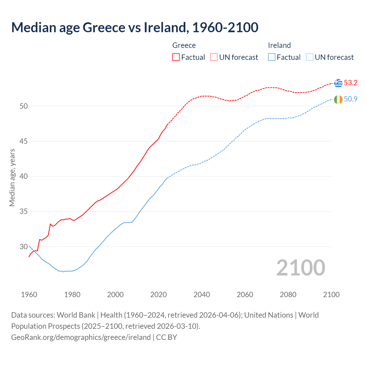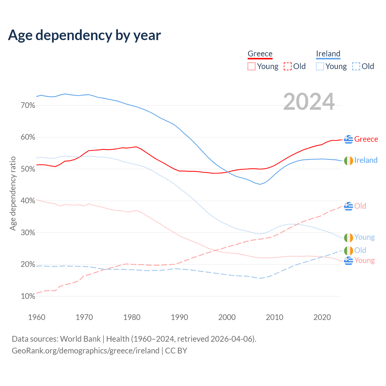 - Greece is ranked 6/196 by median age (oldest to youngest) vs 48/196 for Ireland.