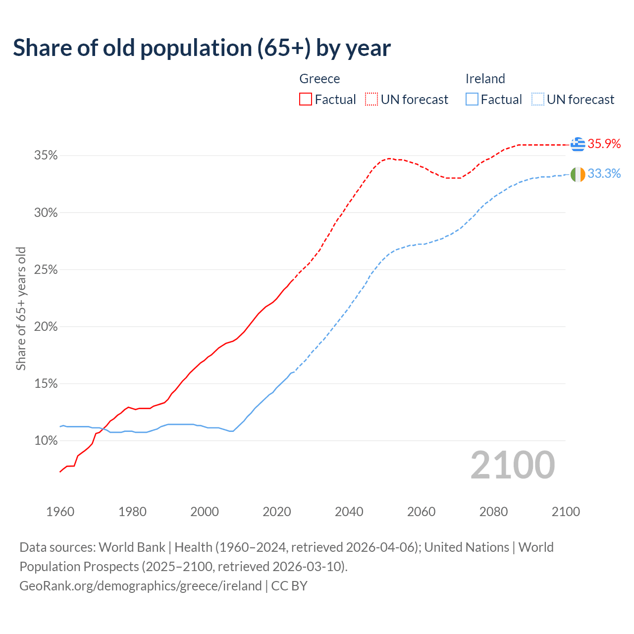 The share of older people aged 65 and over is 23.9% in Greece and 15.9% in Ireland. Life expectancy in Greece compared to Ireland .