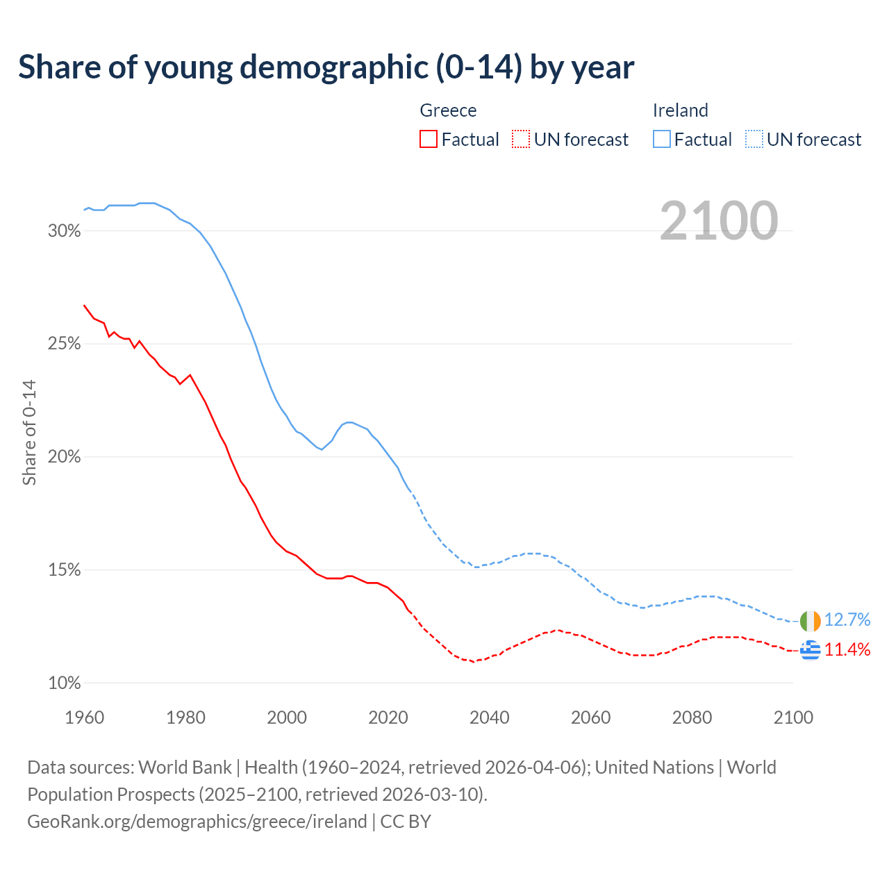 - The share of young demographic (0-15 years old) in Greece is 13.2% vs 18.6% in Ireland.