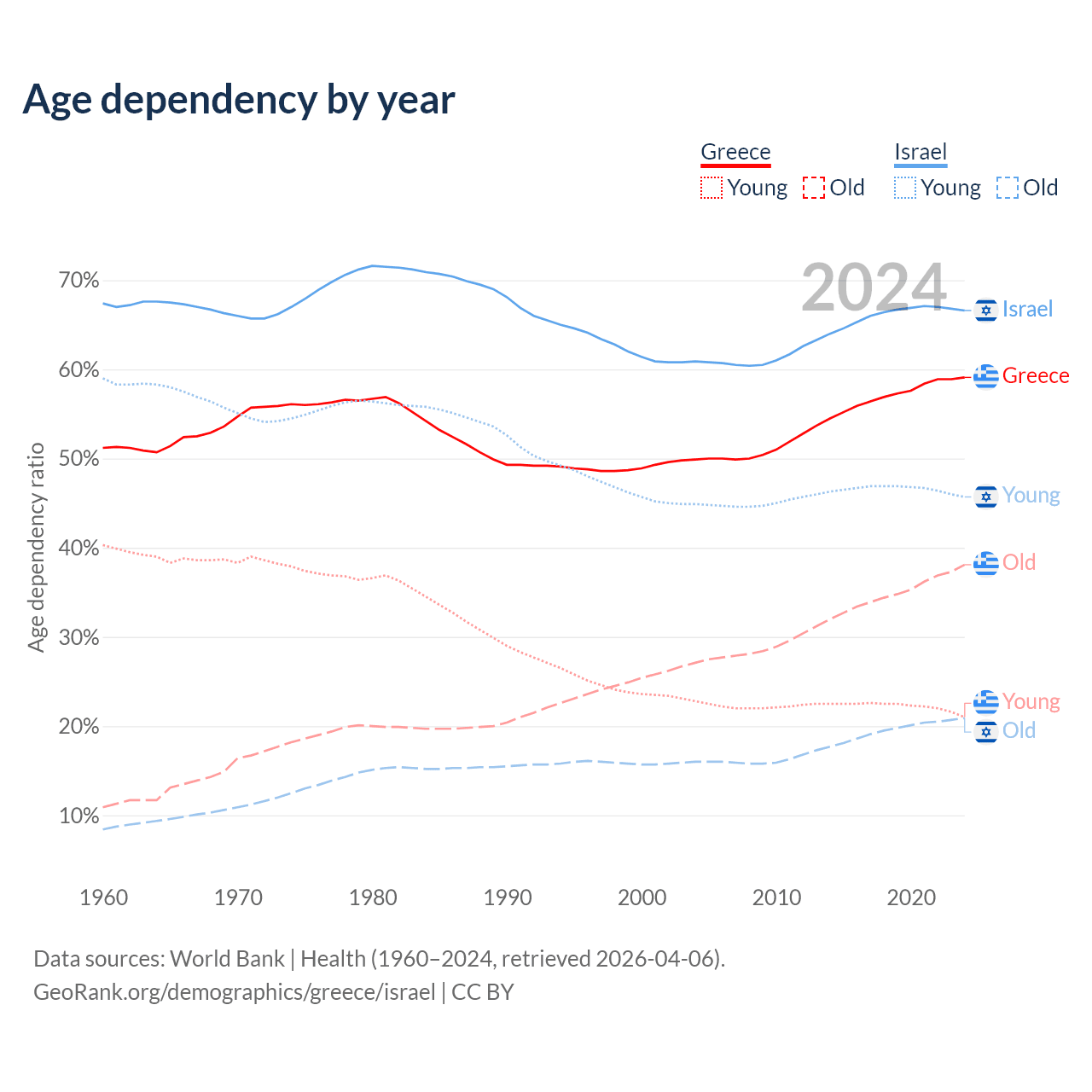 - Greece is ranked 6/196 by median age (oldest to youngest) vs 103/196 for Israel.
