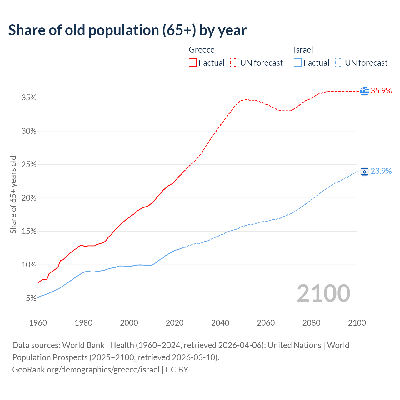 The share of older people aged 65 and over is 23.9% in Greece and 12.6% in Israel. Life expectancy in Greece compared to Israel .
