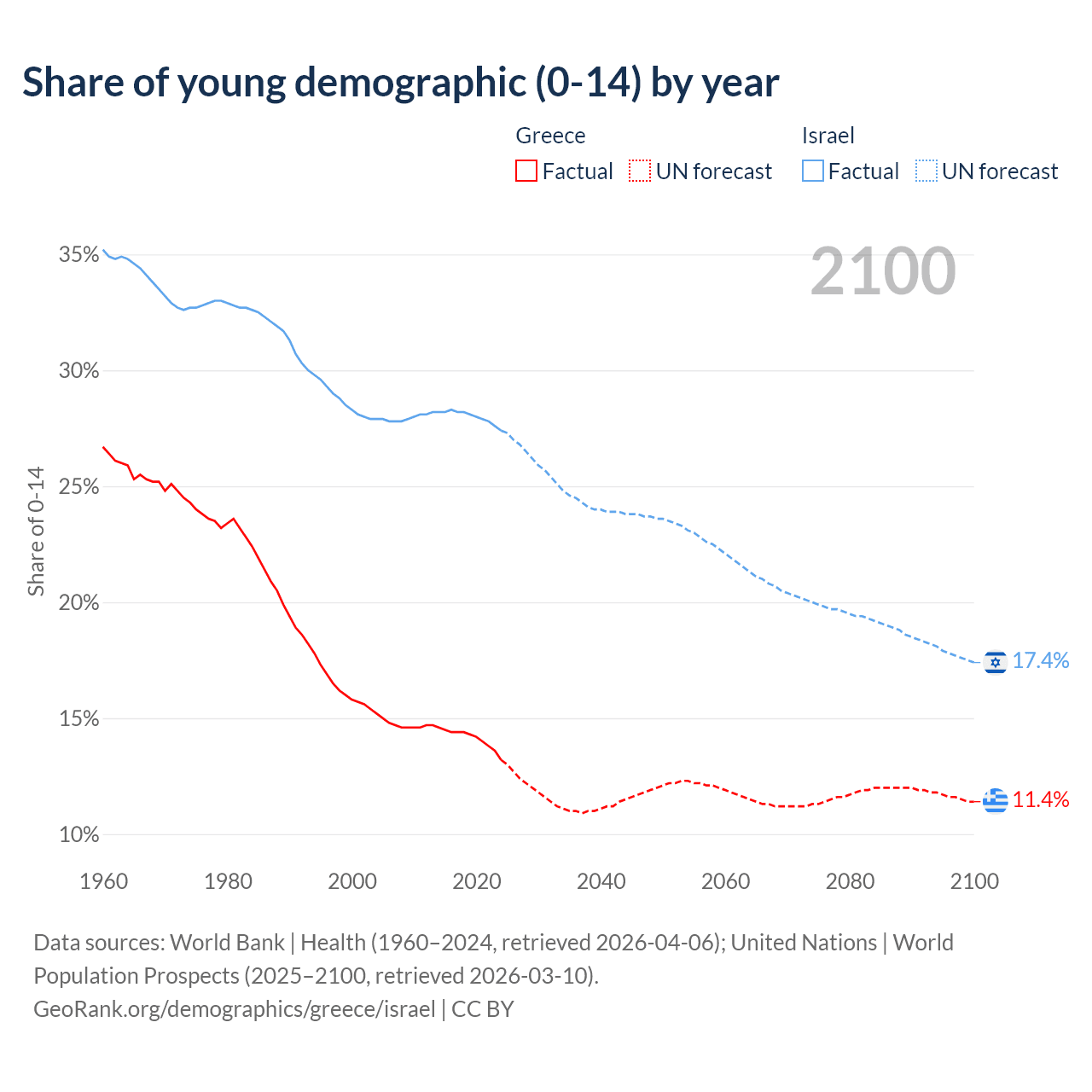 - The share of young demographic (0-15 years old) in Greece is 13.2% vs 27.4% in Israel.