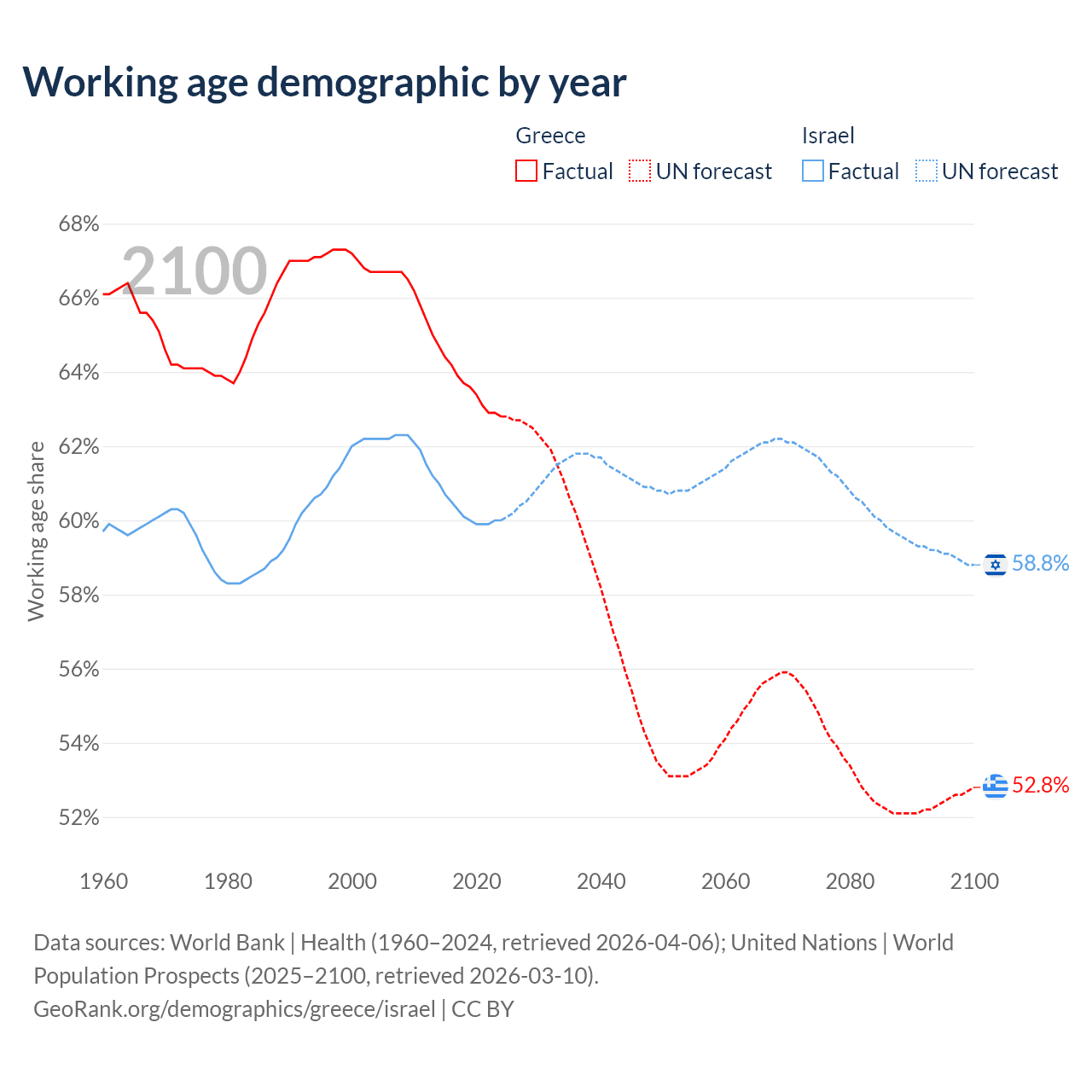 Median age Greece vs Israel, 1960-2100