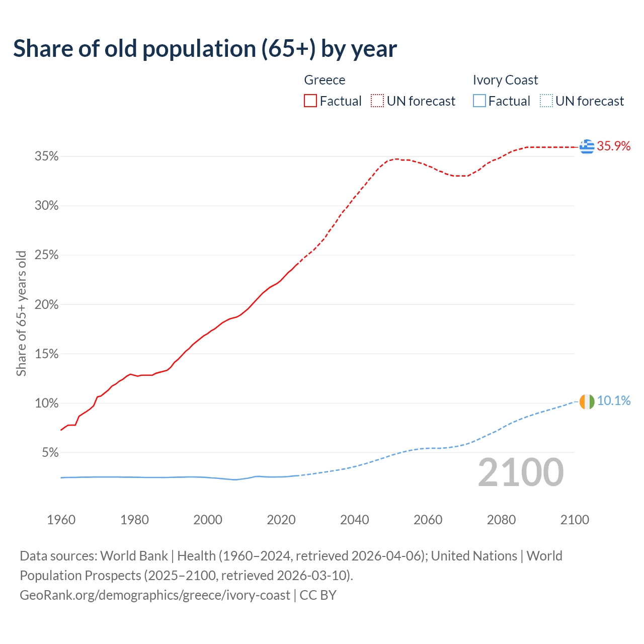 - The share of old-age demographic (65+) in Greece is 23.9% vs 2.61% in Ivory Coast.