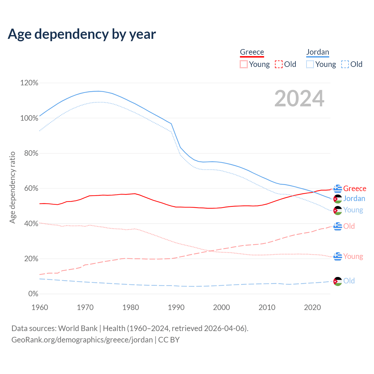 - Greece is ranked 6/196 by median age (oldest to youngest) vs 131/196 for Jordan.