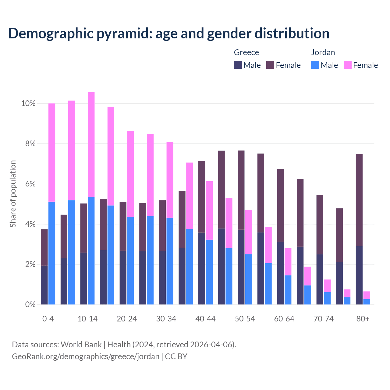 - As of 2026, the population of Greece is 10.2M vs 11.6M in Jordan.