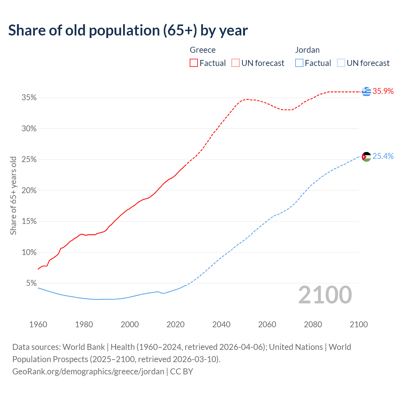 The share of older people aged 65 and over is 23.9% in Greece and 4.52% in Jordan. Life expectancy in Greece compared to Jordan .