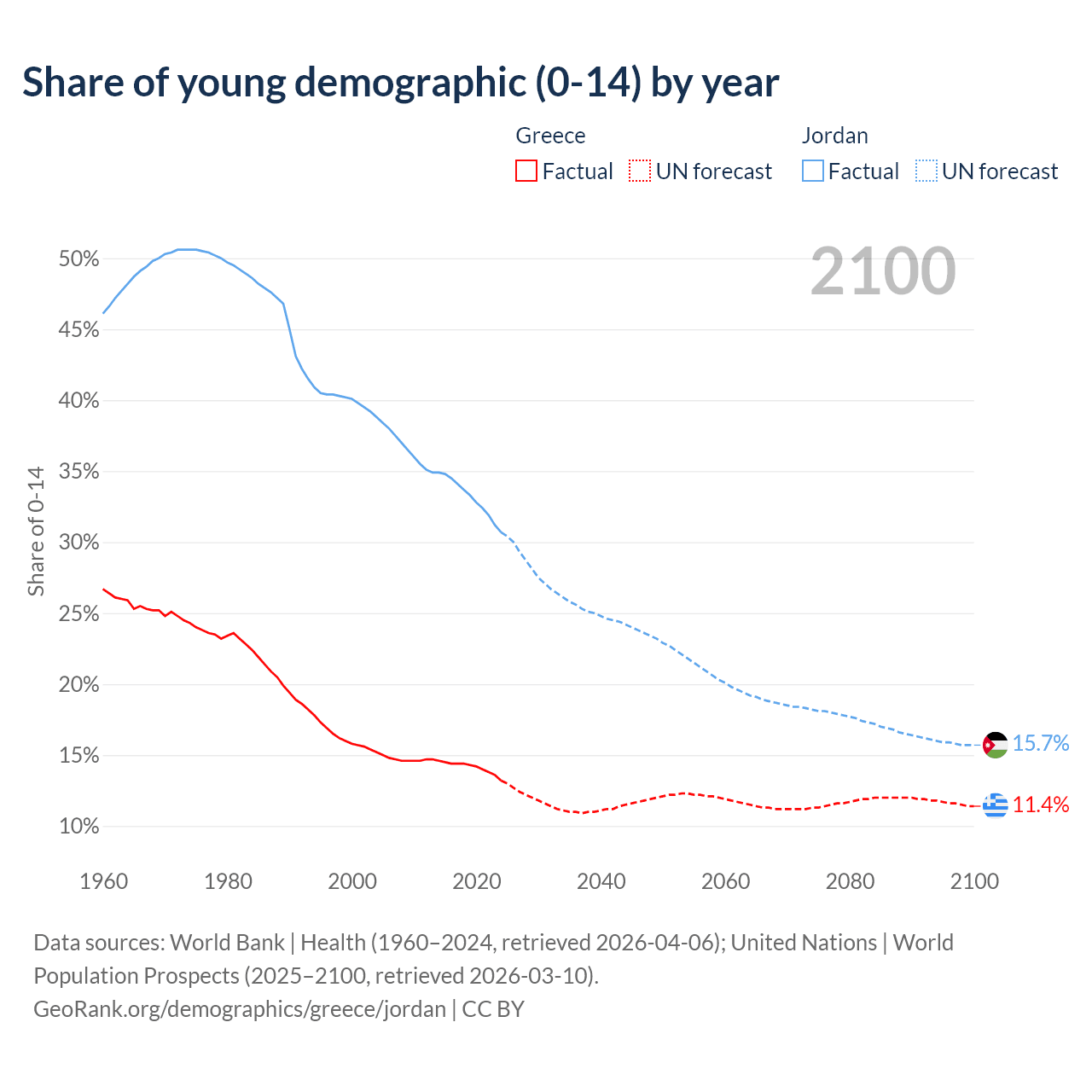 - The share of young demographic (0-15 years old) in Greece is 13.2% vs 30.7% in Jordan.