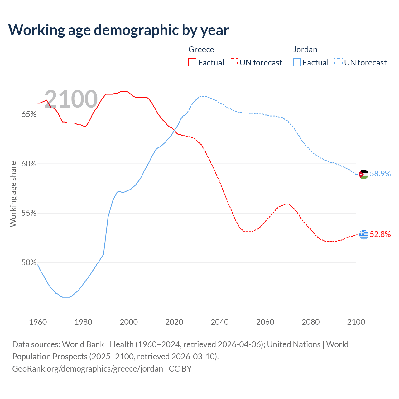 - Greece has 6.4M working age adults (aged 15-64) vs 7.49M in Jordan.