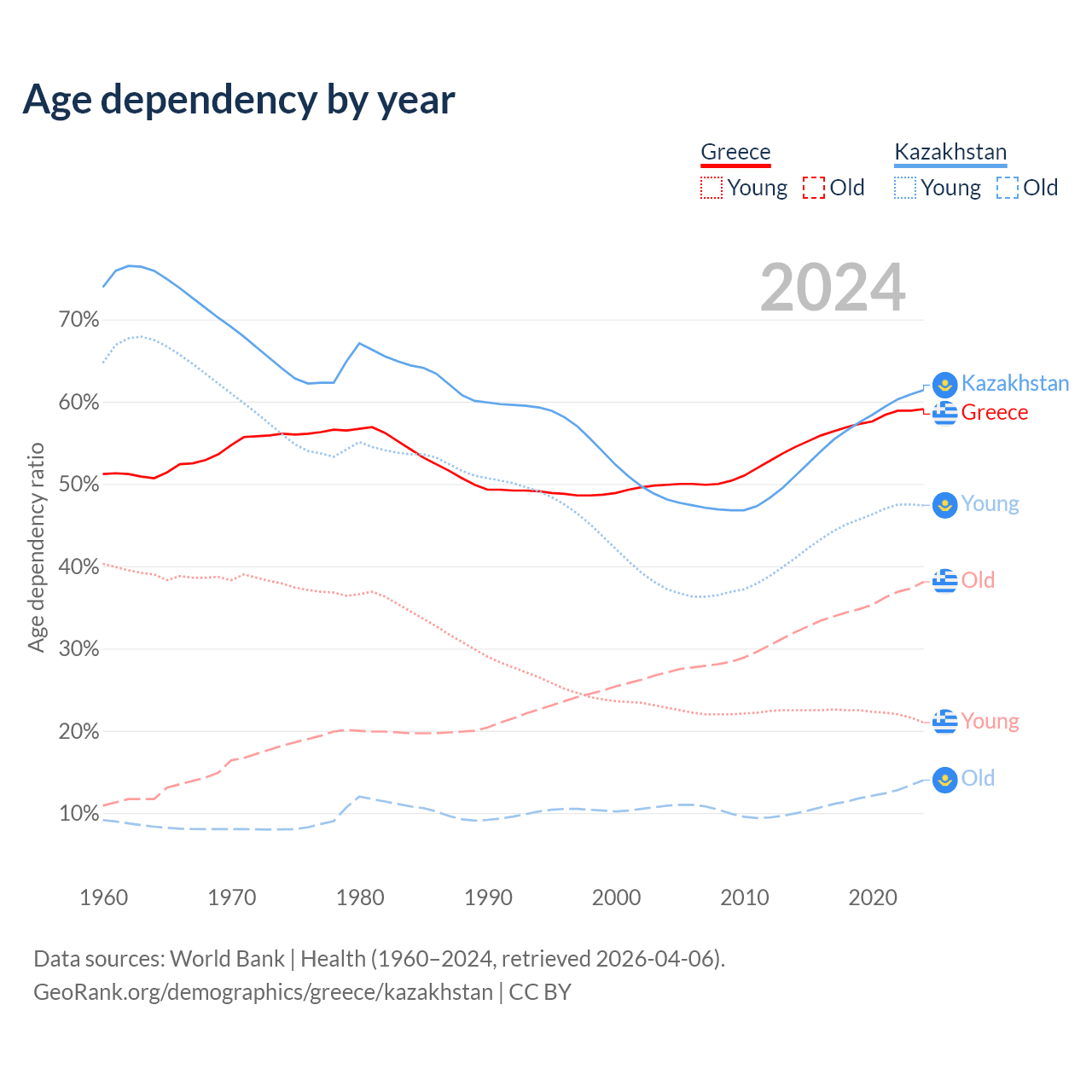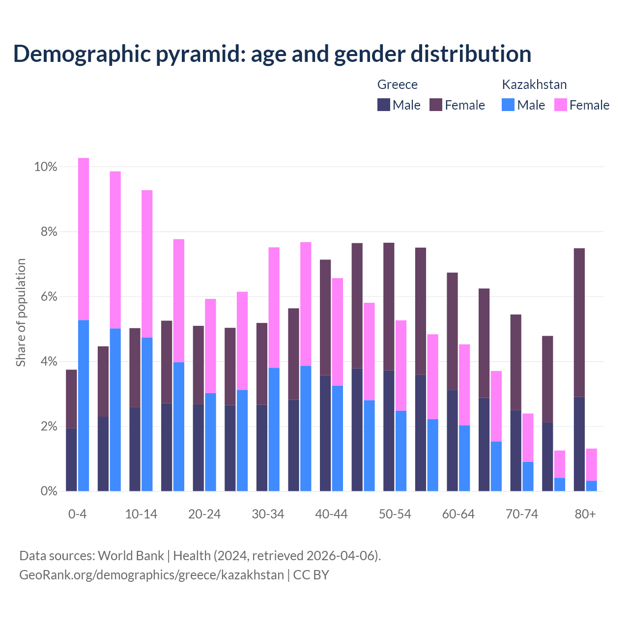 - Greece is ranked 6/196 by median age (oldest to youngest) vs 99/196 for Kazakhstan.