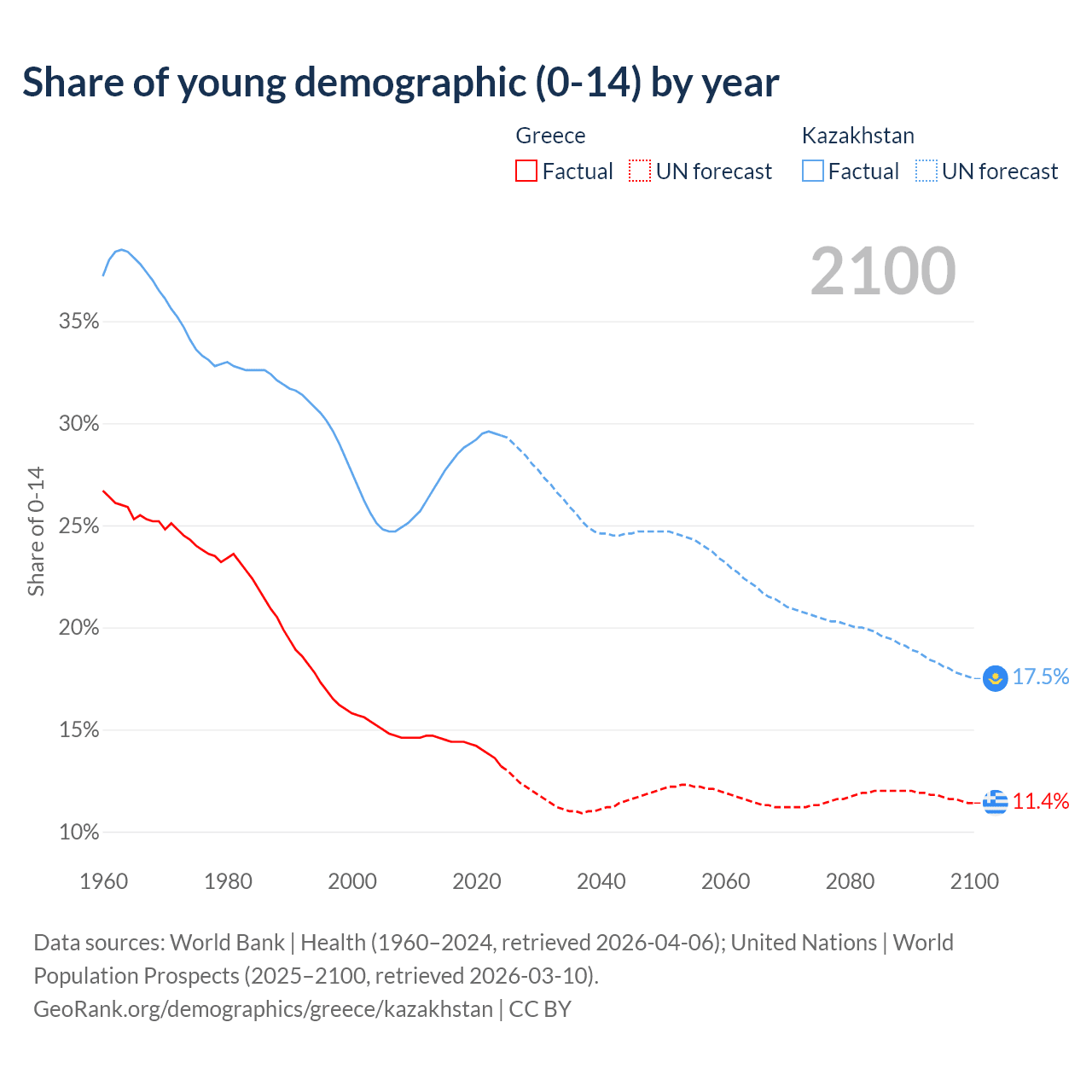 - The share of young demographic (0-15 years old) in Greece is 13.2% vs 29.4% in Kazakhstan.