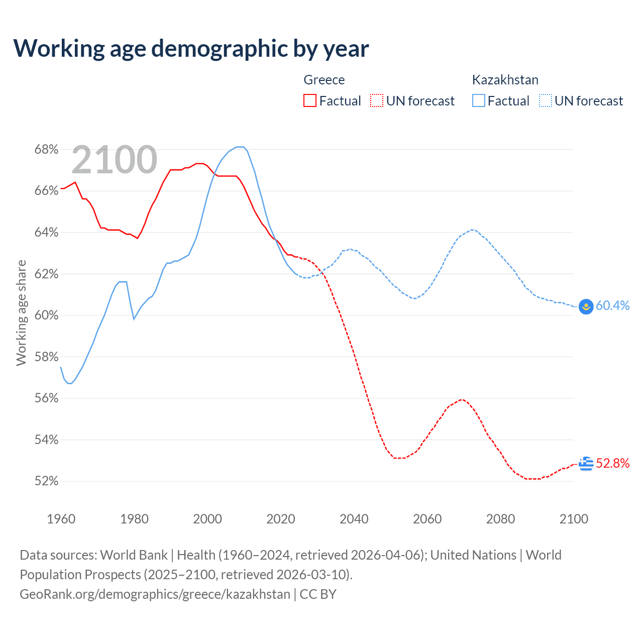 Median age Greece vs Kazakhstan, 1960-2100