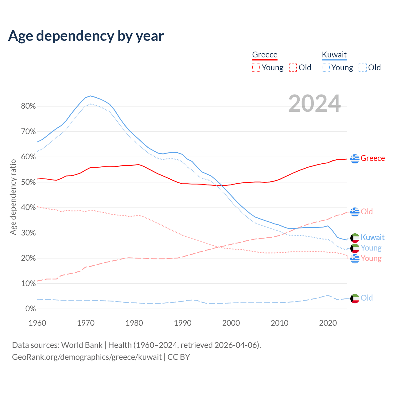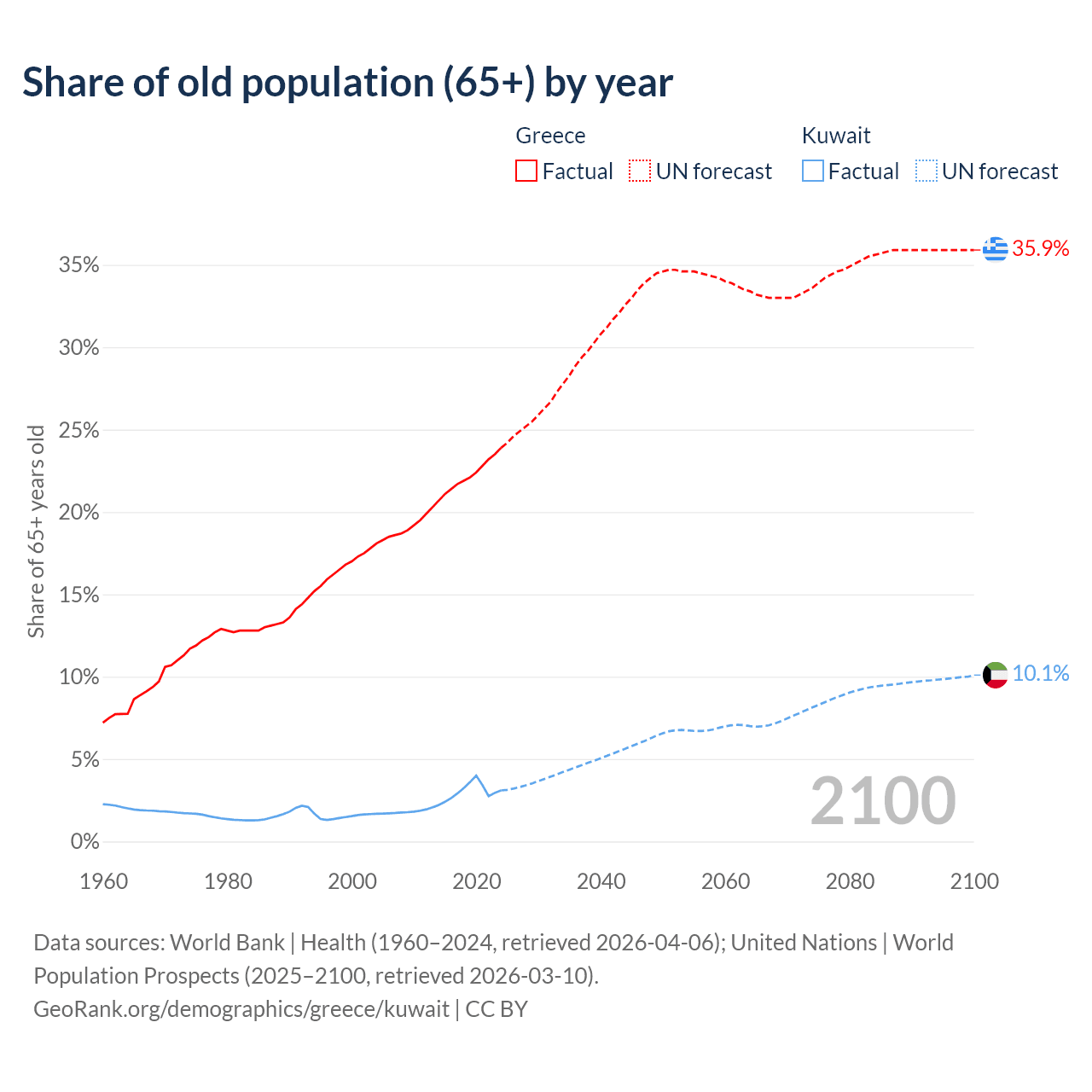 The share of older people aged 65 and over is 23.9% in Greece and 3.1% in Kuwait. Life expectancy in Greece compared to Kuwait .