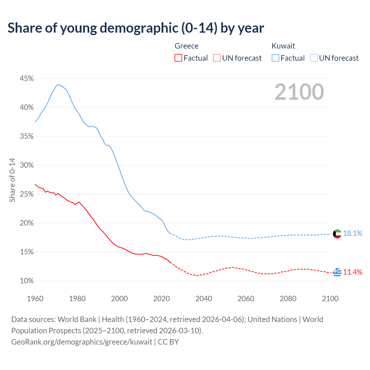 - The share of young demographic (0-15 years old) in Greece is 13.2% vs 18.2% in Kuwait.