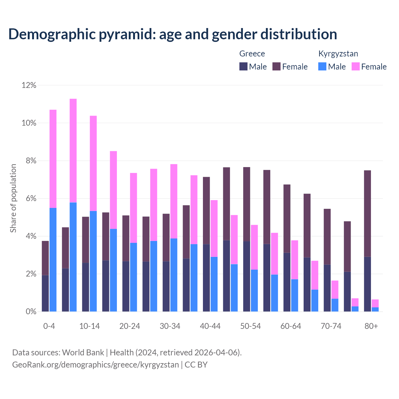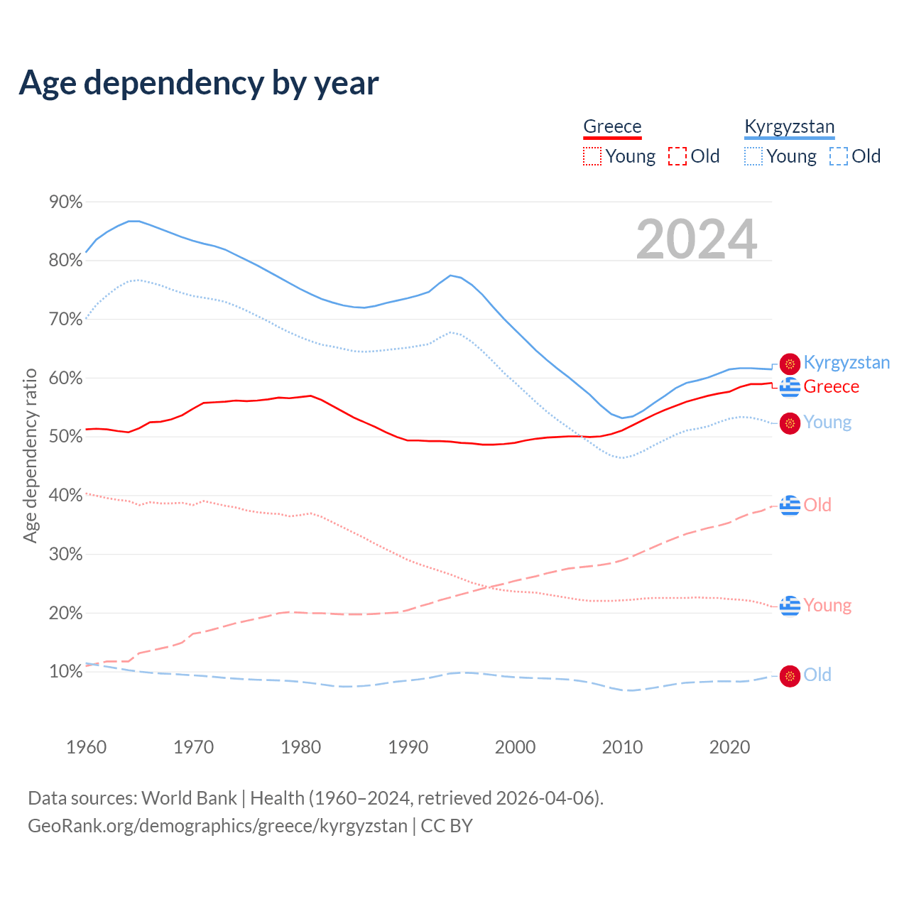 - Greece is ranked 6/196 by median age (oldest to youngest) vs 126/196 for Kyrgyzstan.