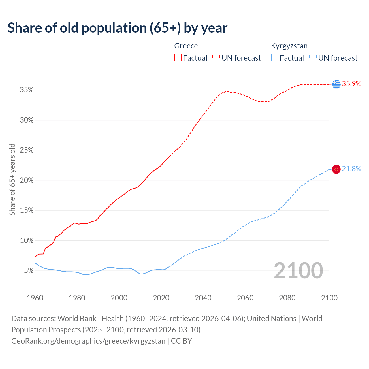 The share of older people aged 65 and over is 23.9% in Greece and 5.68% in Kyrgyzstan. Life expectancy in Greece compared to Kyrgyzstan .