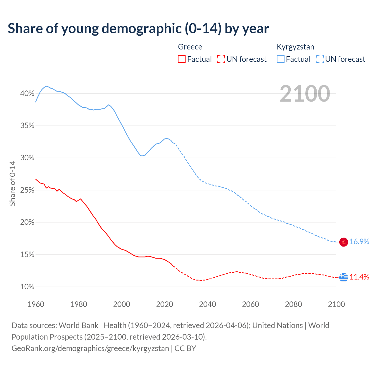 - The share of young demographic (0-15 years old) in Greece is 13.2% vs 32.3% in Kyrgyzstan.