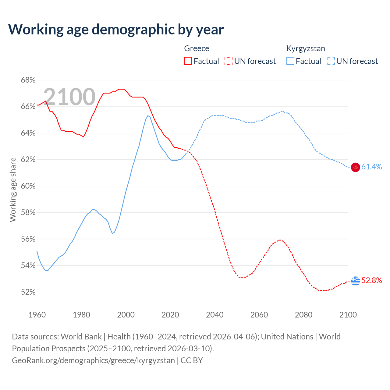 - Greece has 6.4M working age adults (aged 15-64) vs 4.63M in Kyrgyzstan.