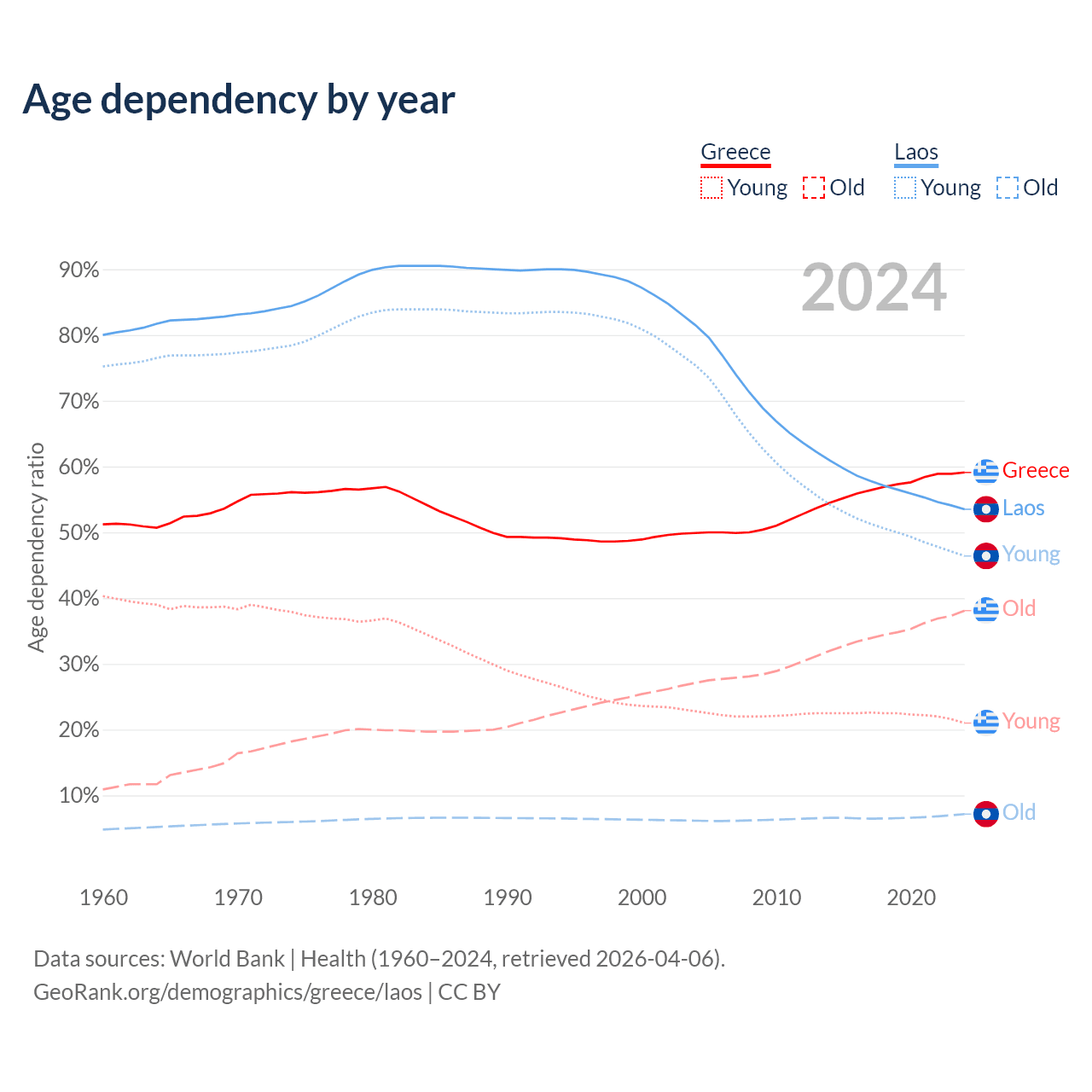 - The share of old-age demographic (65+) in Greece is 23.9% vs 4.67% in Laos.