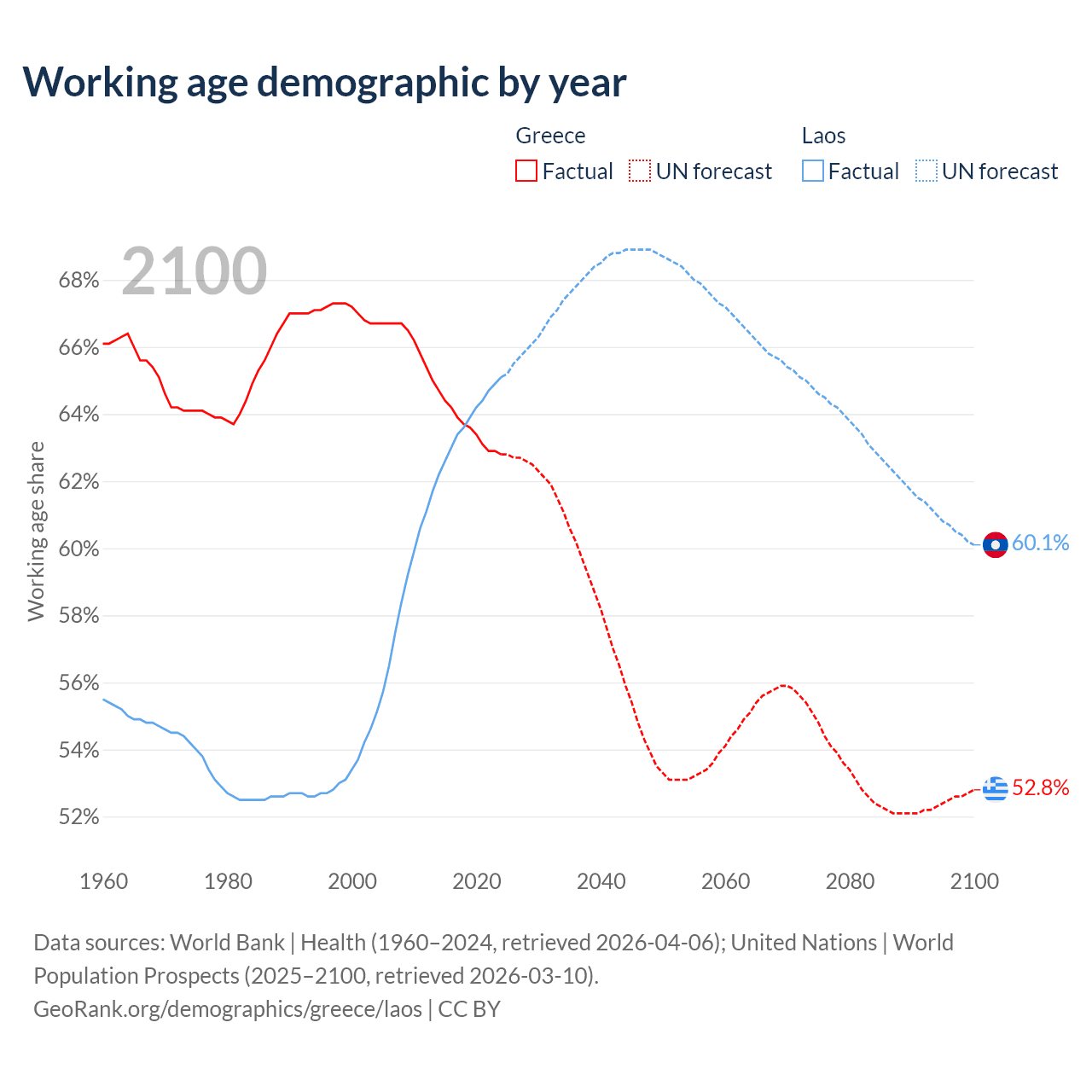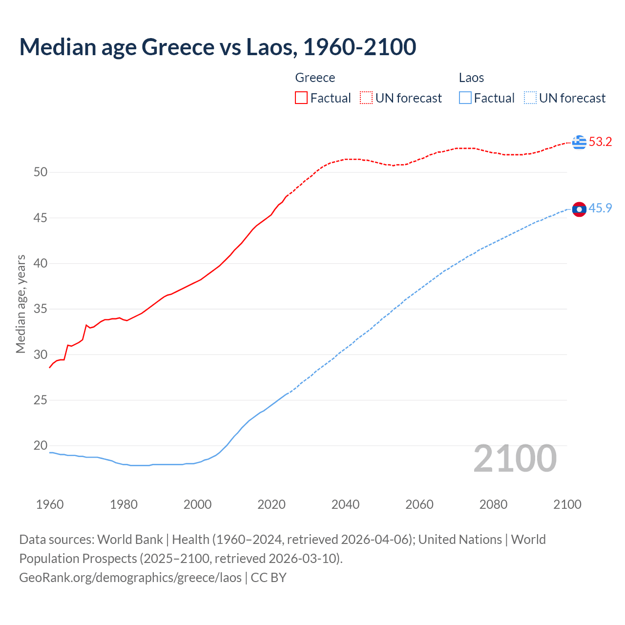 Median age Greece vs Laos, 1960-2100