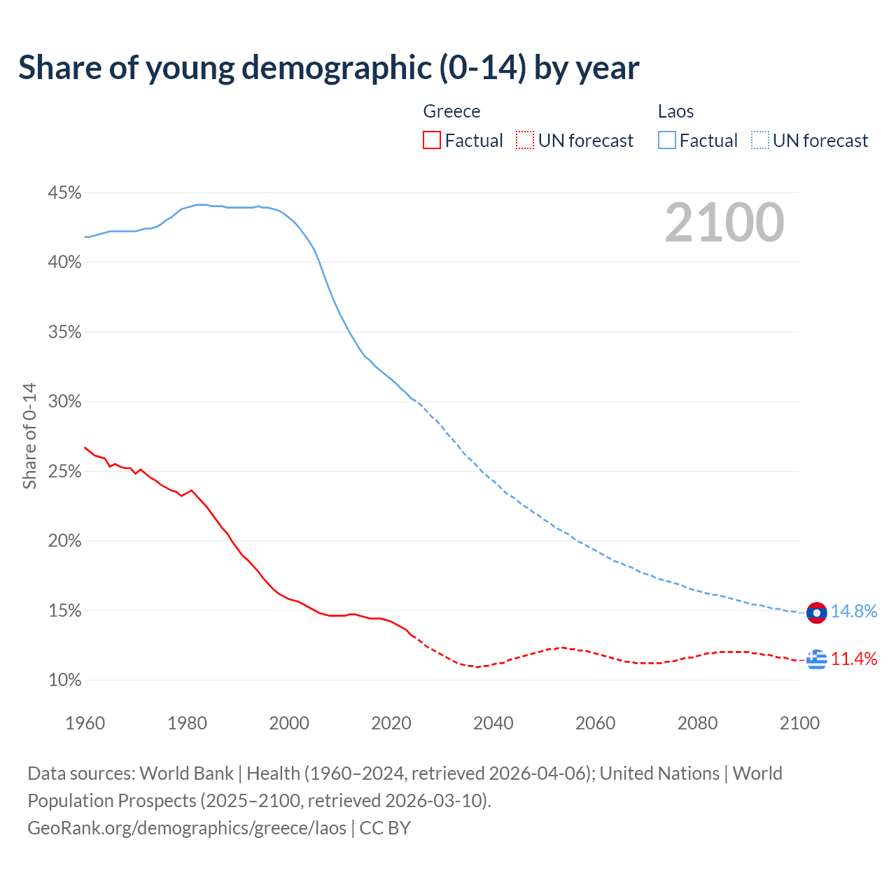 - The share of young demographic (0-15 years old) in Greece is 13.2% vs 30.2% in Laos.