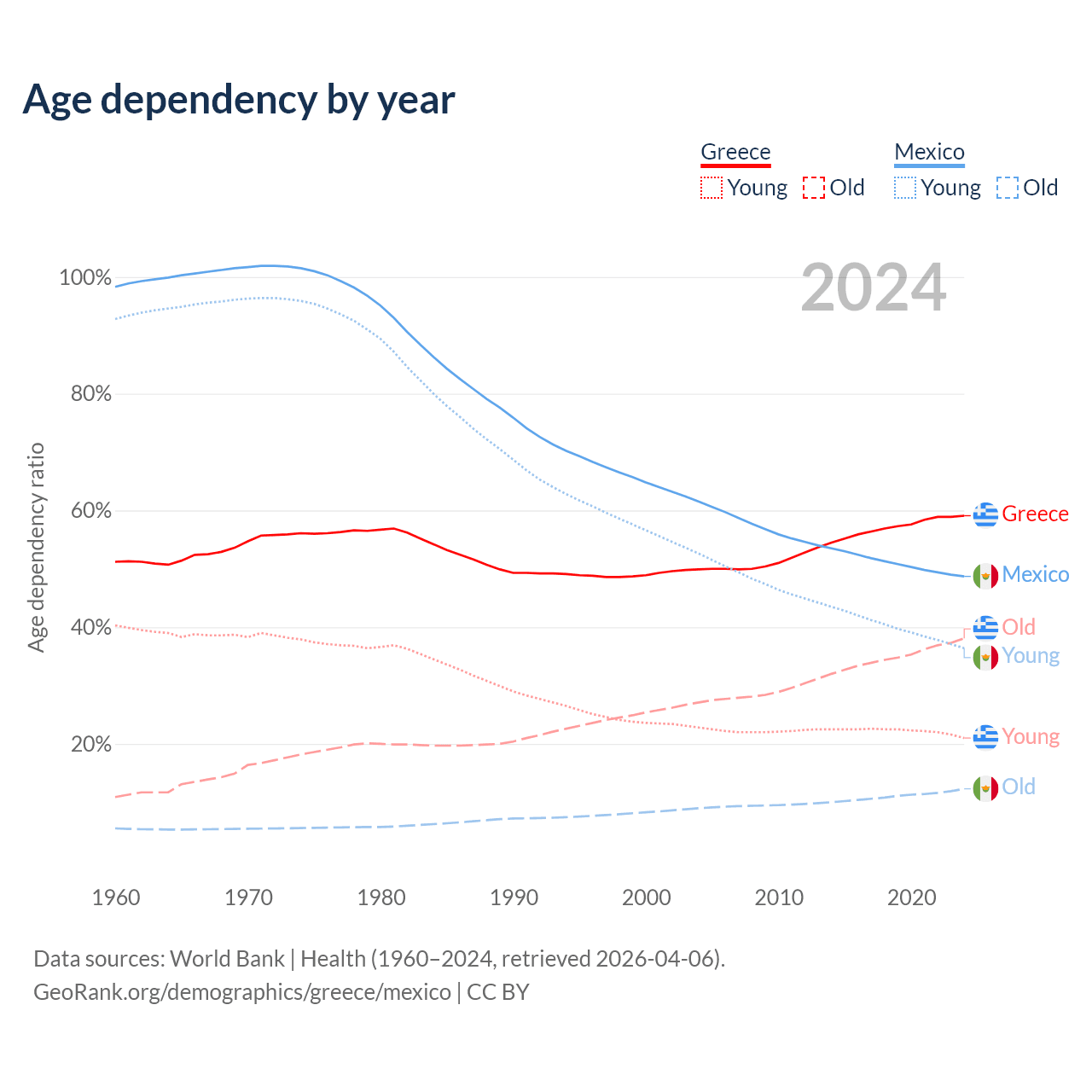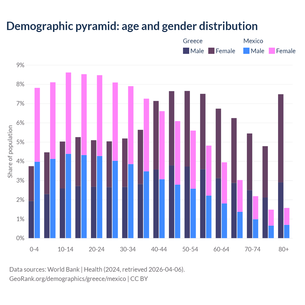 - Greece is ranked 6/196 by median age (oldest to youngest) vs 102/196 for Mexico.