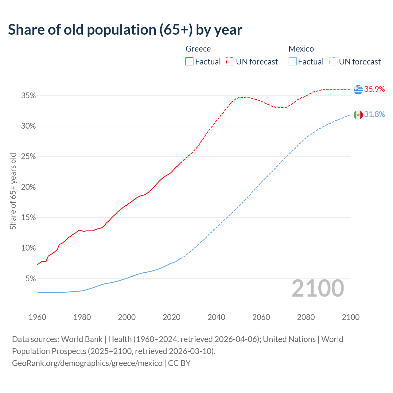 - The share of old-age demographic (65+) in Greece is 23.9% vs 8.25% in Mexico.