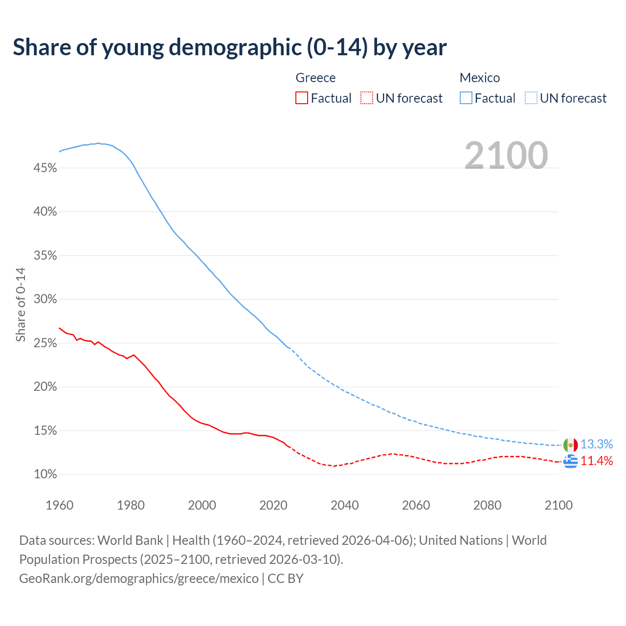 - The share of young demographic (0-15 years old) in Greece is 13.2% vs 24.5% in Mexico.