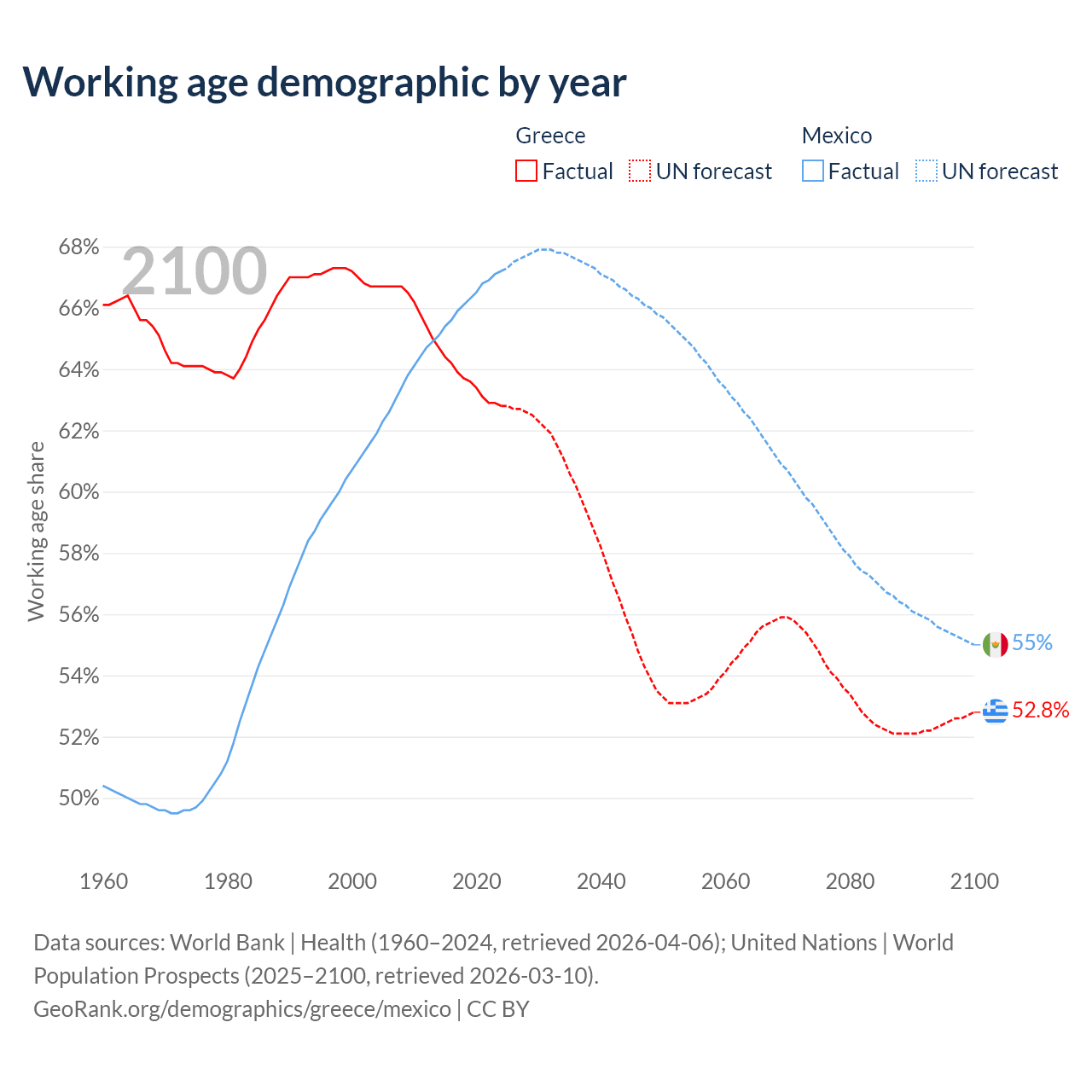 - Greece has 6.4M working age adults (aged 15-64) vs 89.6M in Mexico.