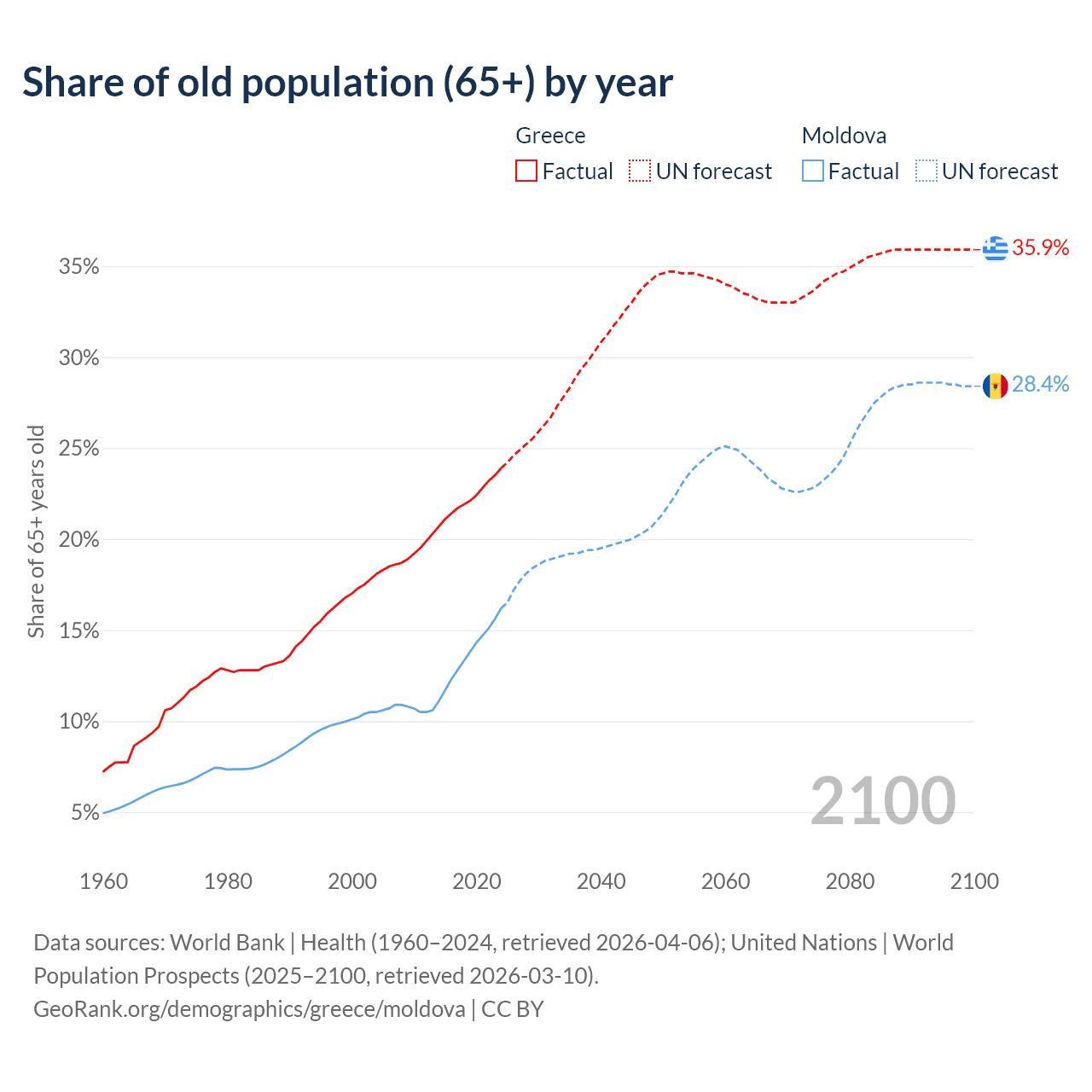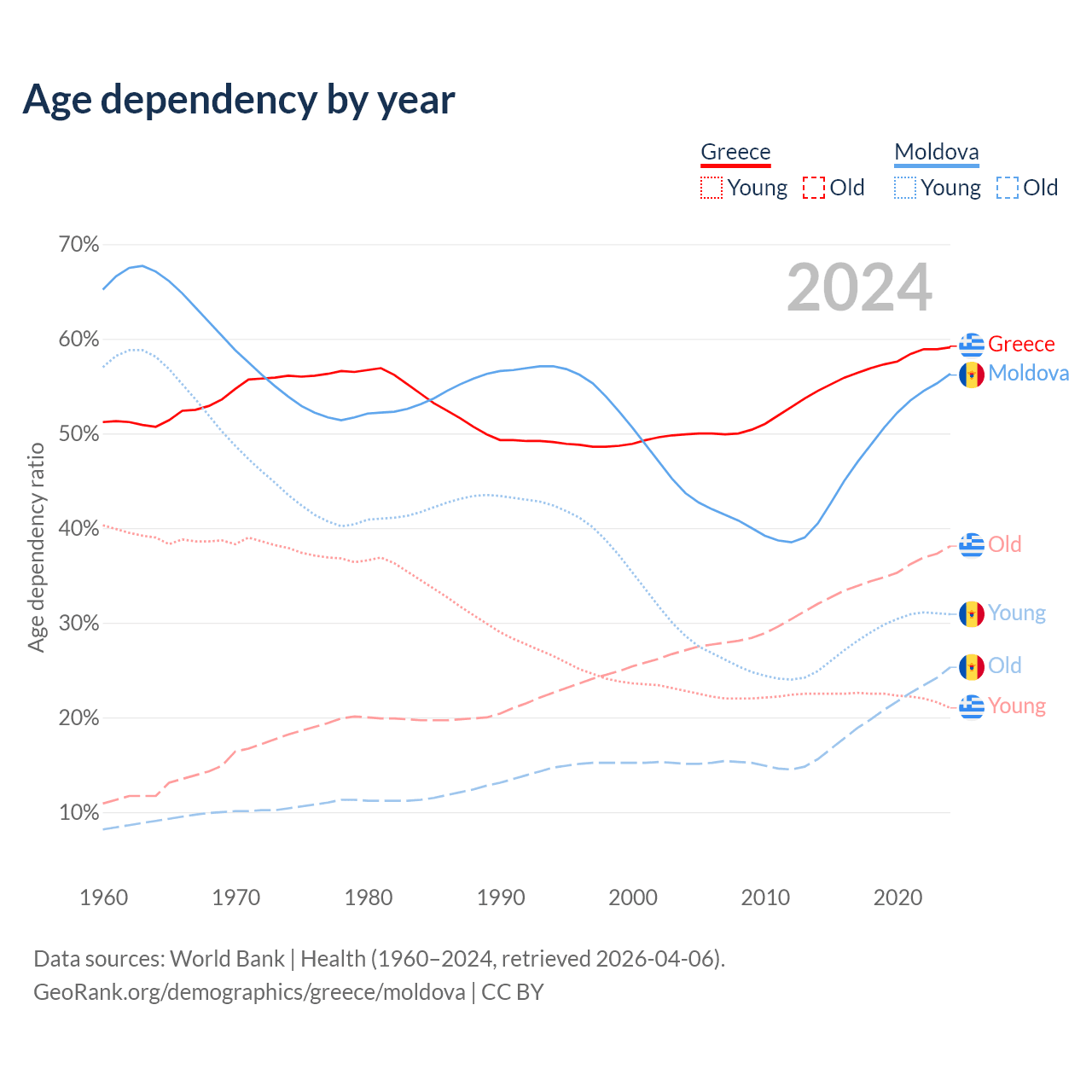 - The share of old-age demographic (65+) in Greece is 23.9% vs 16.2% in Moldova.