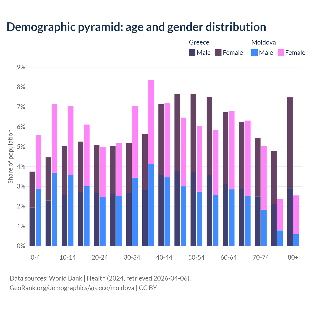- As of 2026, the population of Greece is 10.2M vs 2.34M in Moldova - 4.35 times difference.