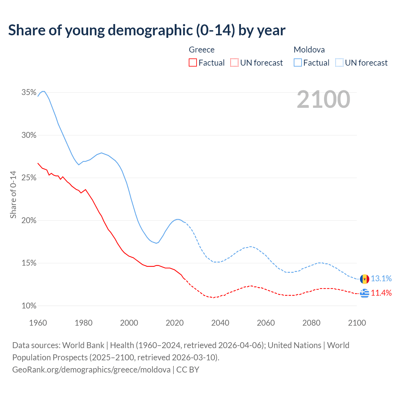 - The share of young demographic (0-15 years old) in Greece is 13.2% vs 19.8% in Moldova.