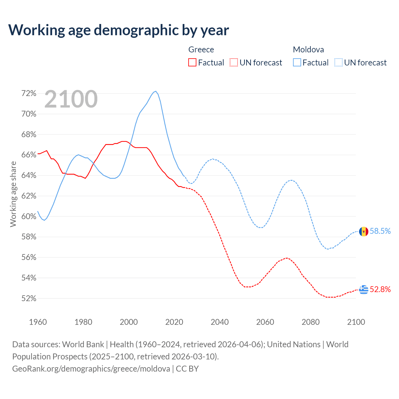 - Greece has 6.4M working age adults (aged 15-64) vs 1.5M in Moldova.