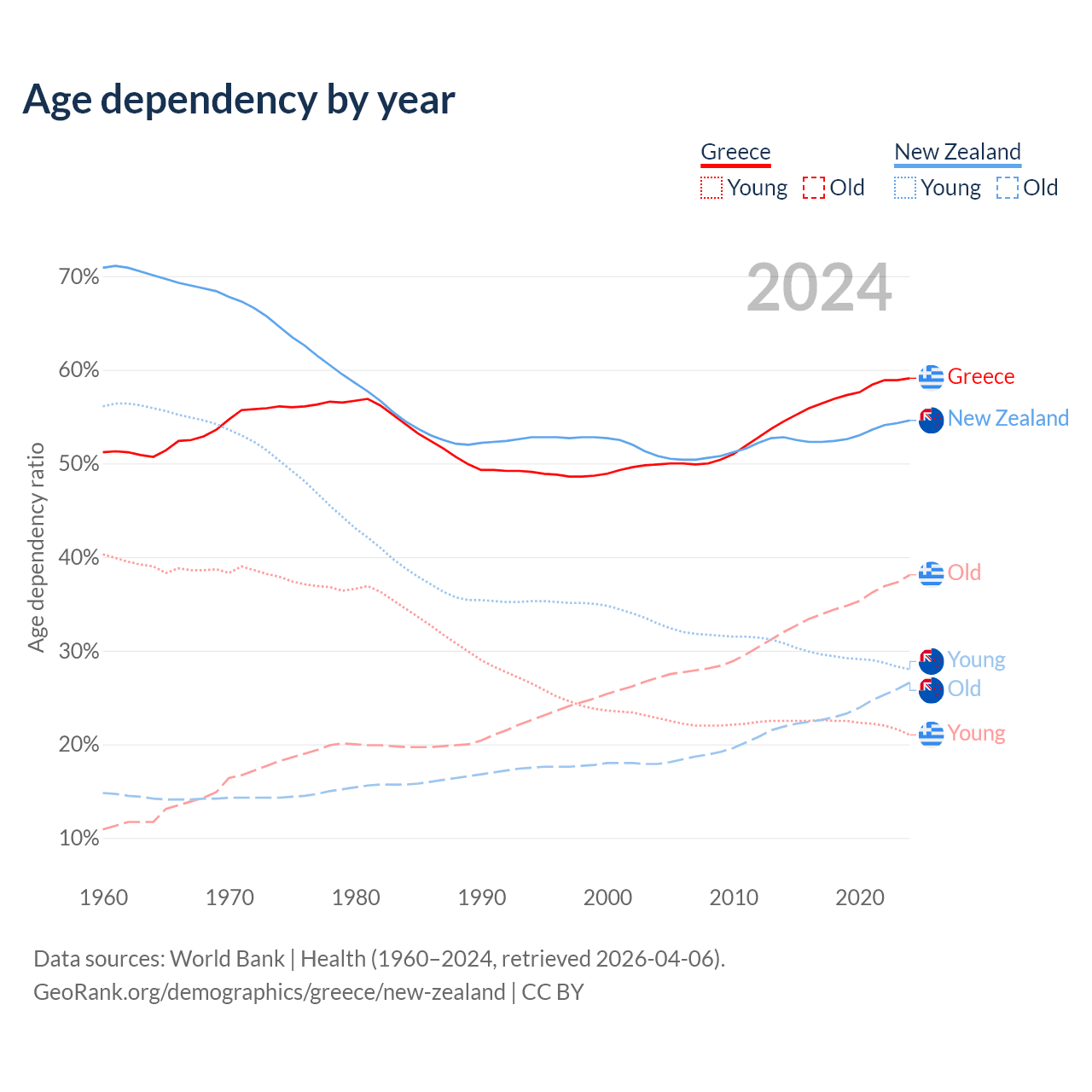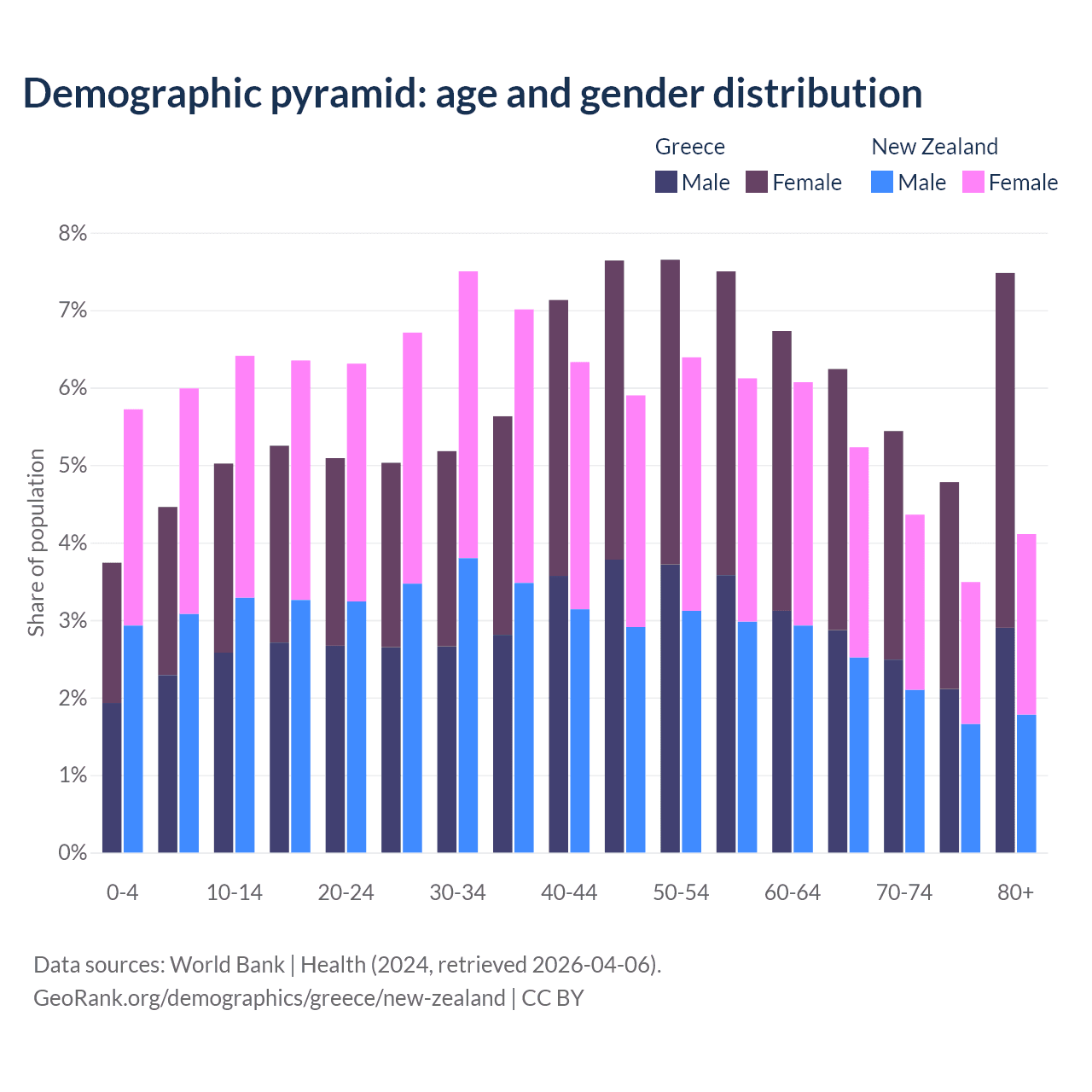 - Greece is ranked 6/196 by median age (oldest to youngest) vs 56/196 for New Zealand.