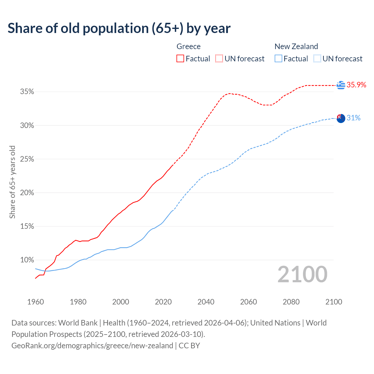- The share of old-age demographic (65+) in Greece is 23.9% vs 17.2% in New Zealand.